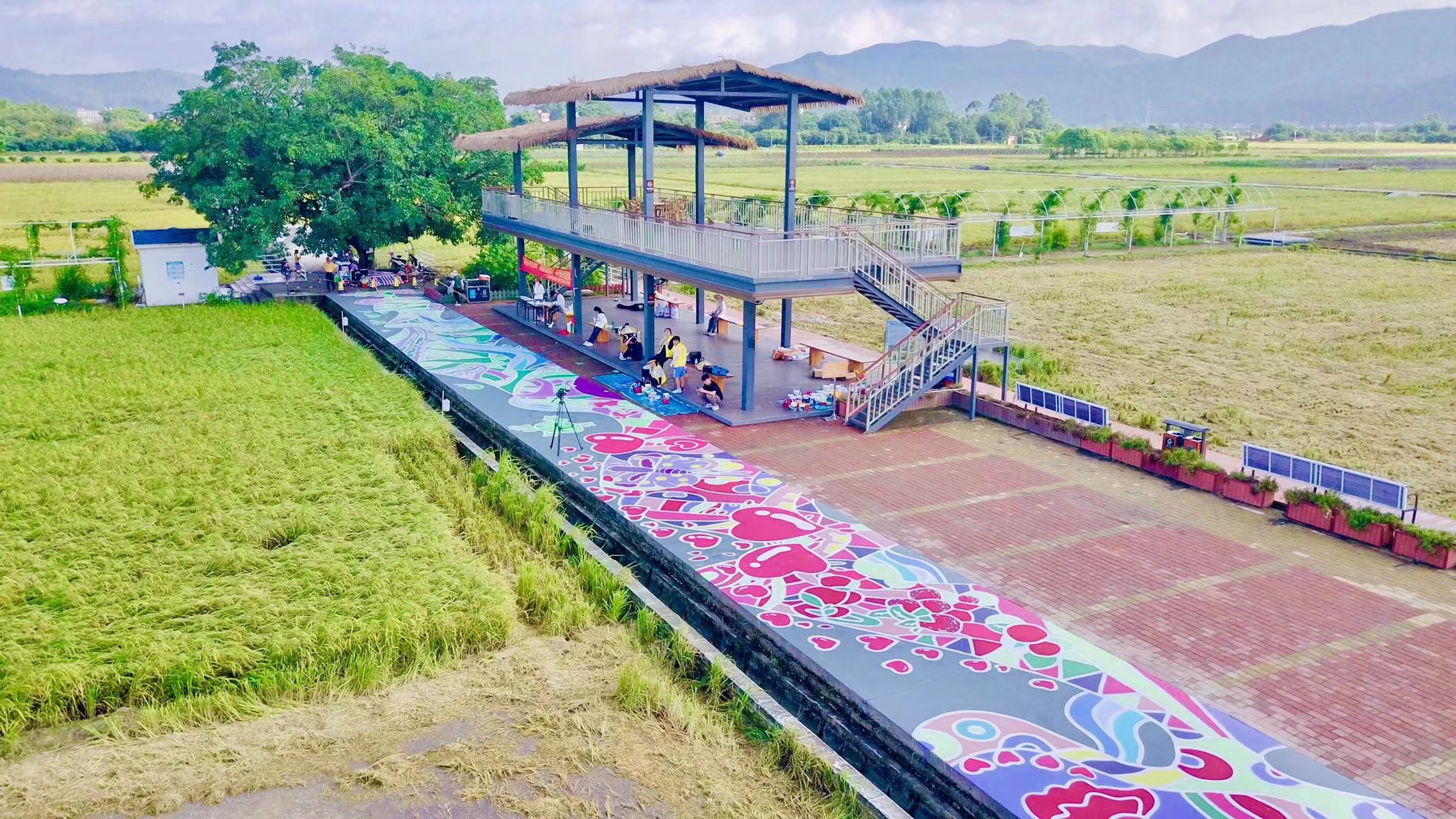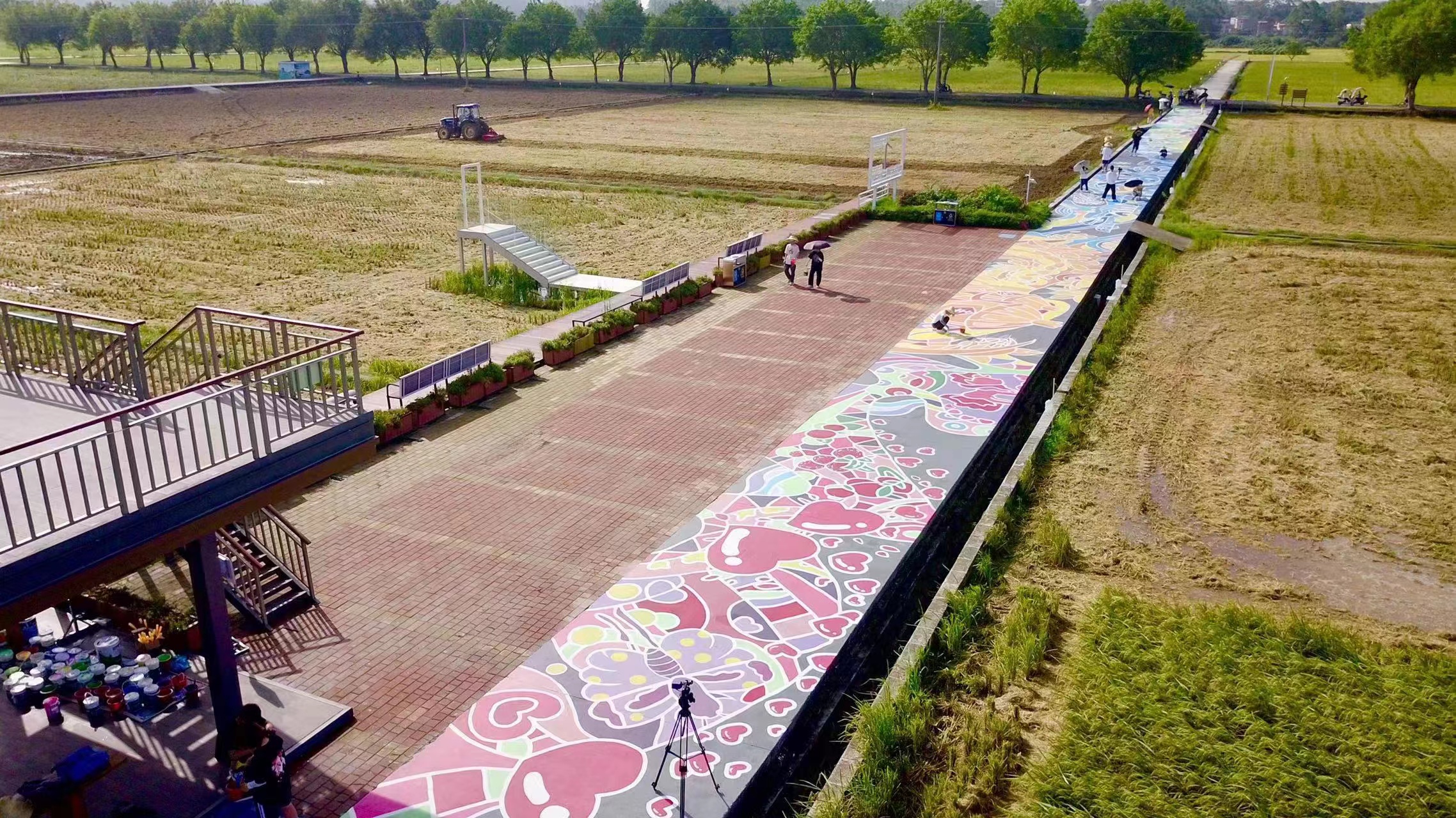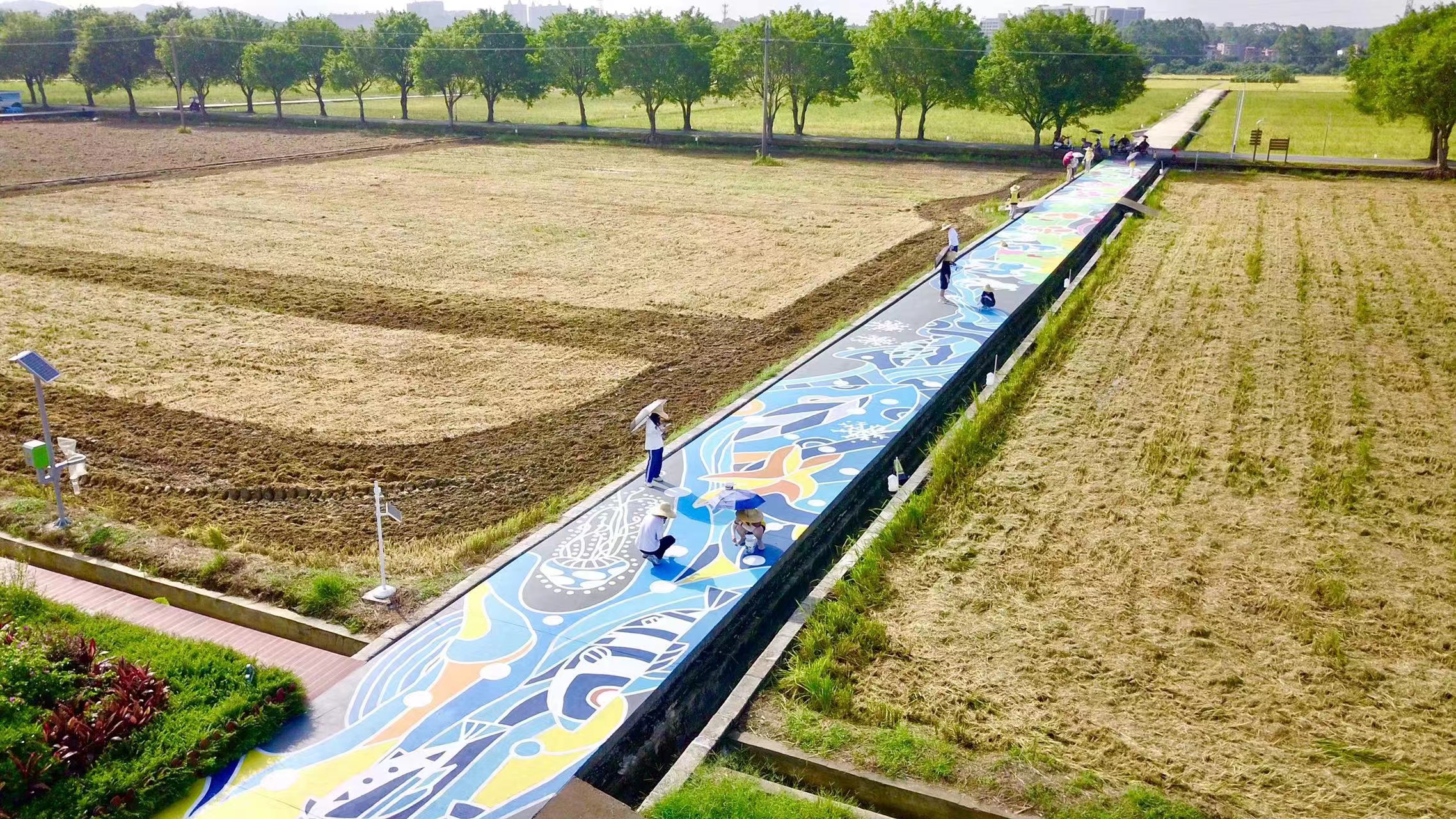 在刚刚过去的七月,2022年广东大中专学生志愿者暑期文化科技卫生“三下乡”社会实践活动火热开展,乡村绘画师是其特色项目之一。这次活动中,广州番禺职业技术学院实践团队的28名师生走进广州增城朱村,在一望无际的稻田间,手绘出长达168米的画卷,描绘朱村四季流转之美,用艺术设计赋能乡村振兴。“我们希望用创意绘画美化乡村风貌,打造亲子旅游美育打卡点,为朱村引流,同时展现和宣传乡村振兴的图景。”广州番禺职业技术学院艺术设计学院团委书记蔡美风介绍说。目前,村民、游客已经可以在创意绘画上行走,观画赏景两不误,车辆行走也无障碍。