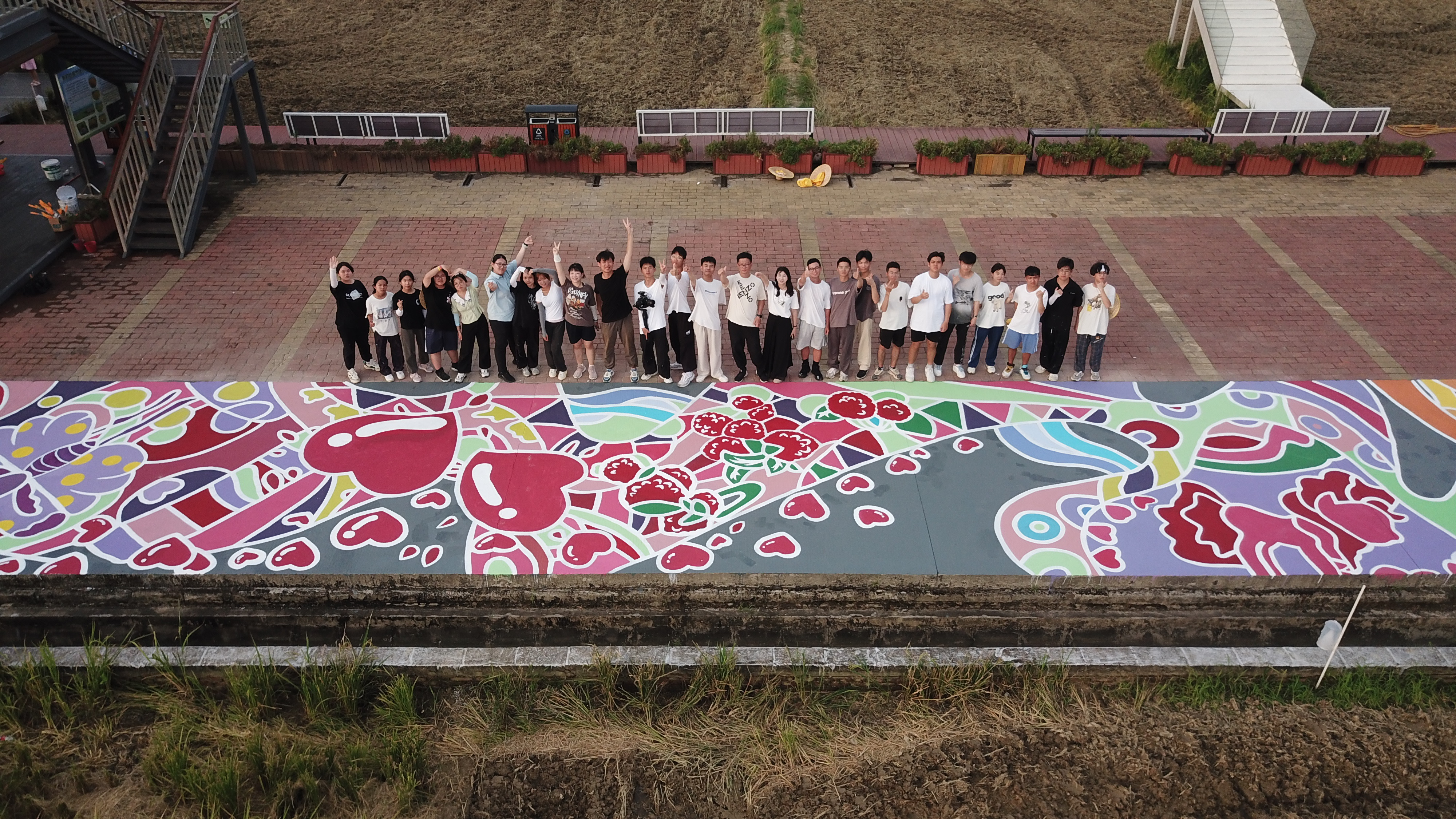当地村民一路见证着巨幅机耕路创意绘画从无到有的整个过程。一位在附近跳广场舞的村民每日来给工作中的师生拍照。“你们辛苦了,真不容易!”“真棒!”,当作品完成之时,不少村民向师生道谢、点赞。