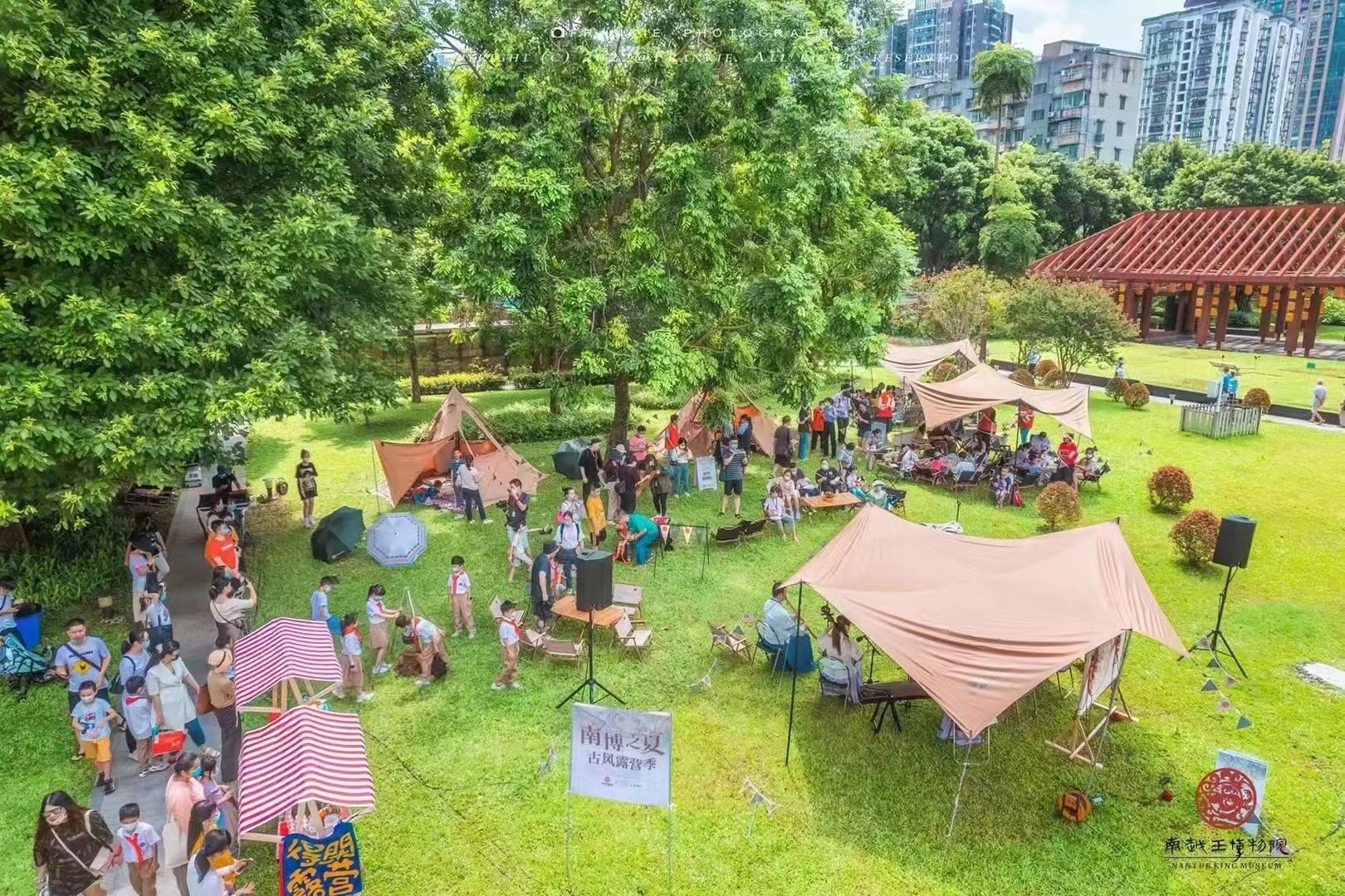 王宫展区的地面之下,是一代代积累起来的考古遗址。经过几代考古学者的悉心考察,其中的一部分被回填保护,以利将来的展示、研究和利用。在它们之上的草坪中露营,仿若漫步在时光里,在明月之下与古人对话。记者曾向院方相关负责人了解,这样的露营活动并不会影响到遗址的保护,更多地是让大家充分认识到城市中心有这样一处大遗址,是多么的难能可贵。当悠扬的乐曲响起,洁白的露营天幕下回荡着儿童的欢笑,岭南文化在一双双巧手下逐渐苏醒,一幕幕充盈着夏日青草和阳光气息的美好记忆则被永远定格。