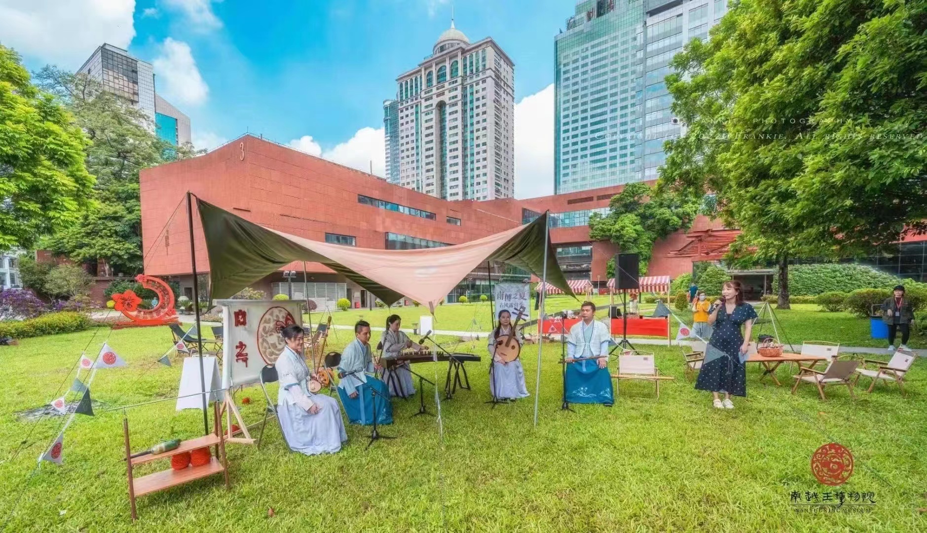 日前,南越王博物院与Mountain Lake 山湖营地联袂打造的古风露营研学活动“南博之夏·古风露营季”在王宫展区正式启动。露营季的首个专题——“国风曲艺大赏”如期在王宫展区举行。该场活动邀请广东音乐曲艺团的老师们为市民朋友们演奏岭南曲艺,随着《雨打芭蕉》 《彩云追月》《旱天雷》《步步高》等一首首耳熟能详的名曲在博物院草坪上空回荡,20组亲子家庭在王宫展区草坪上开启了一场独特的研学露营活动。在户外露营场景烘托下,参与家庭在现场聆听悠扬雅致的曲韵,充分感受着古筝、中阮、笛子、椰胡、二胡等中国传统乐器的独特魅力。