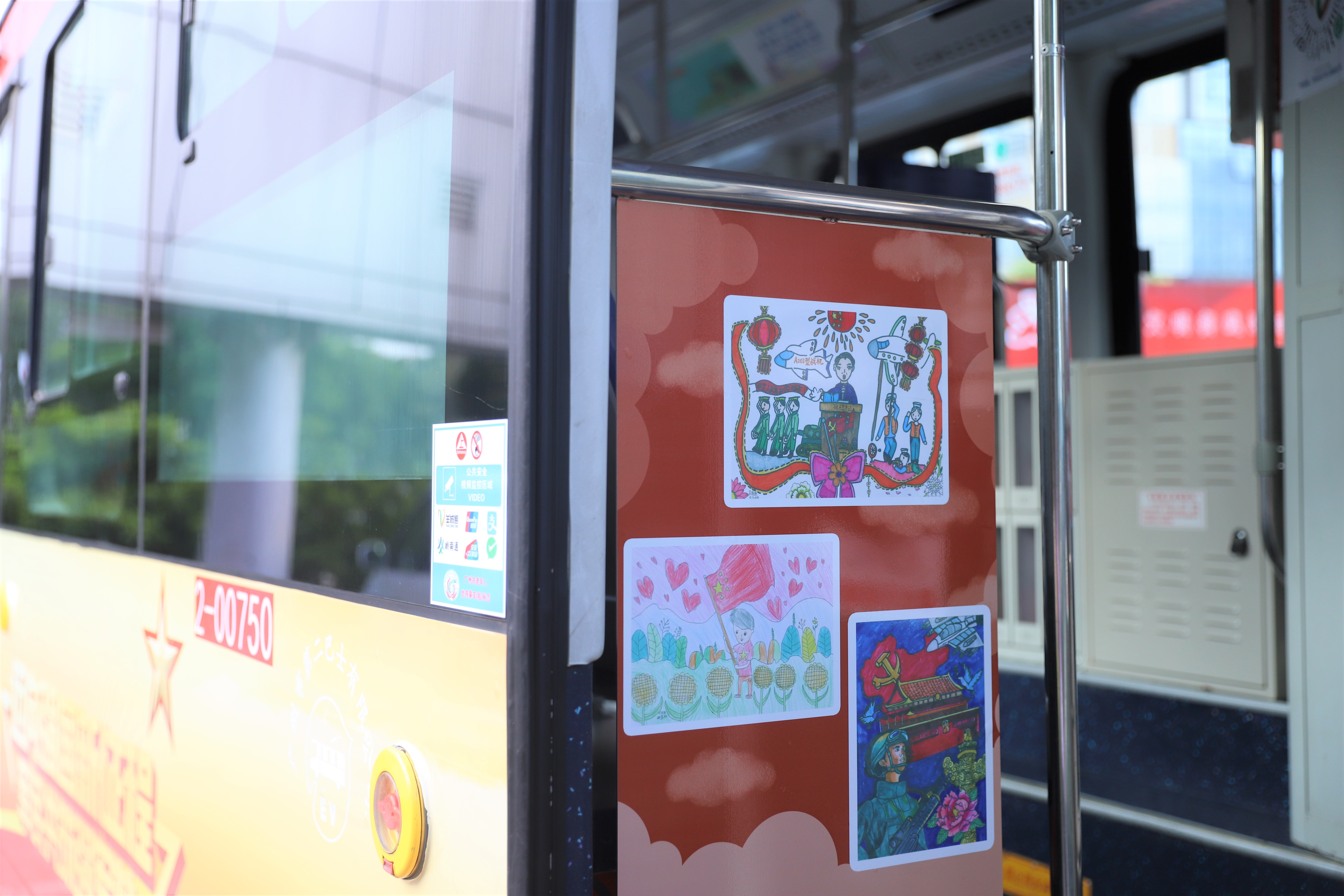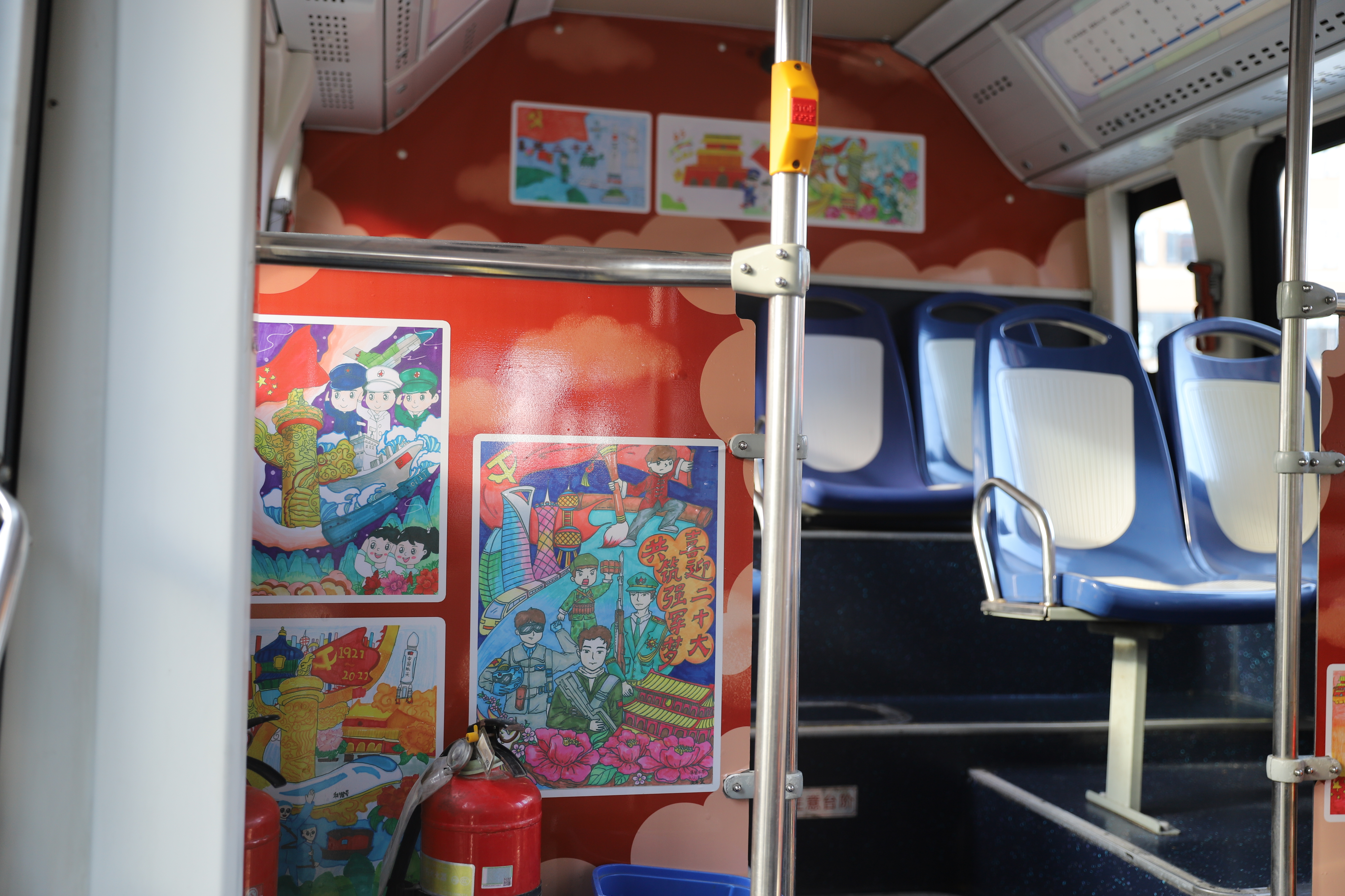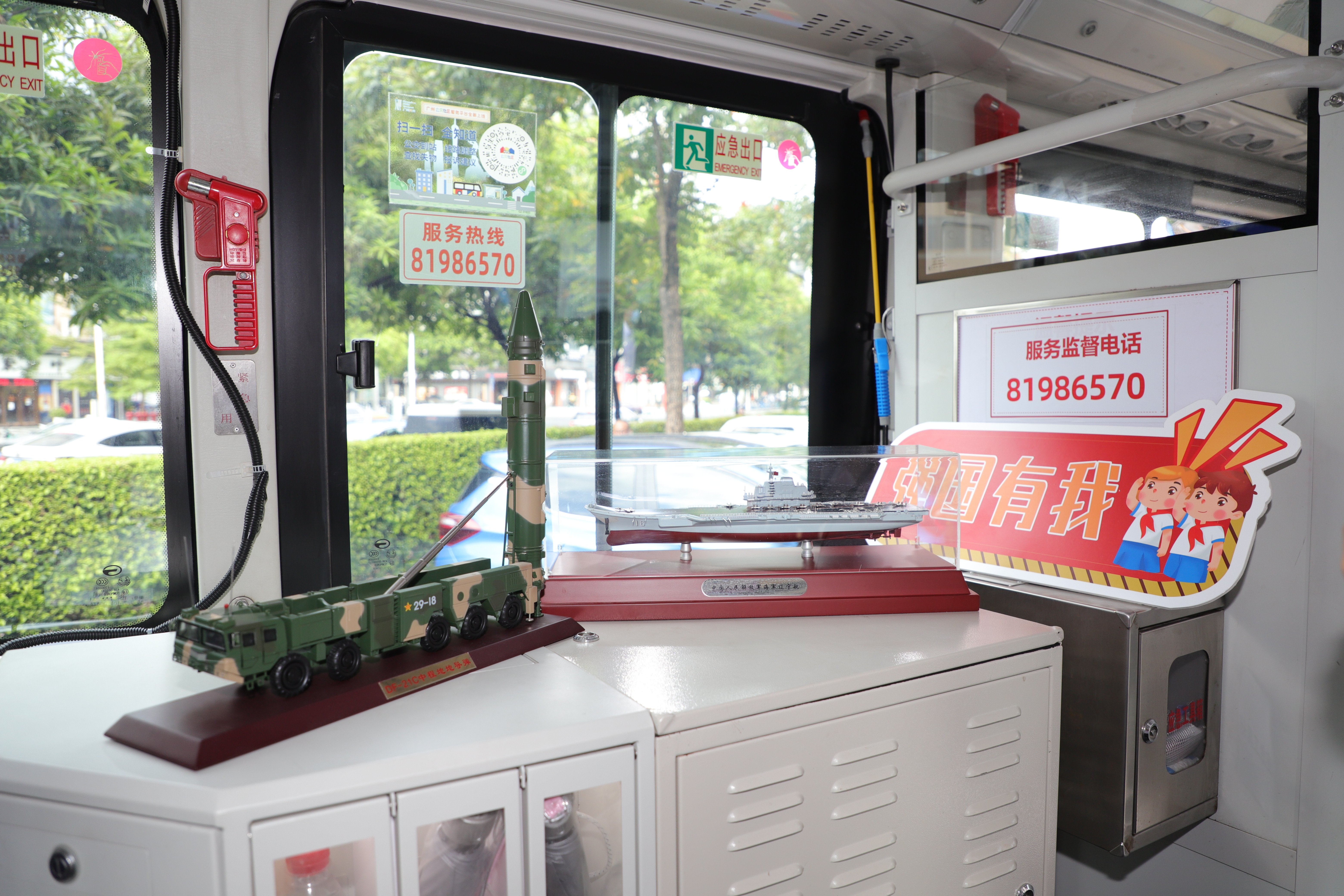 活动中投放的国防军事主题公交车,以车身为载体,融入国防军事、爱国强国设计元素,成为路上流动的国防教育宣传风景线。走进车厢记者看到,车内摆放有中国人民解放军海军辽宁舰、DF-21C中程地地导弹模型,车厢内印有由小朋友手绘的爱国爱军主题绘画,生动展现国防教育进校园的成果。