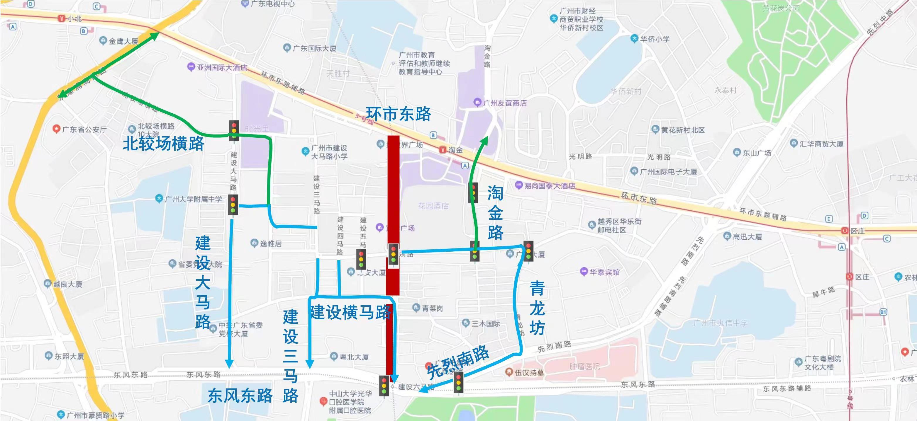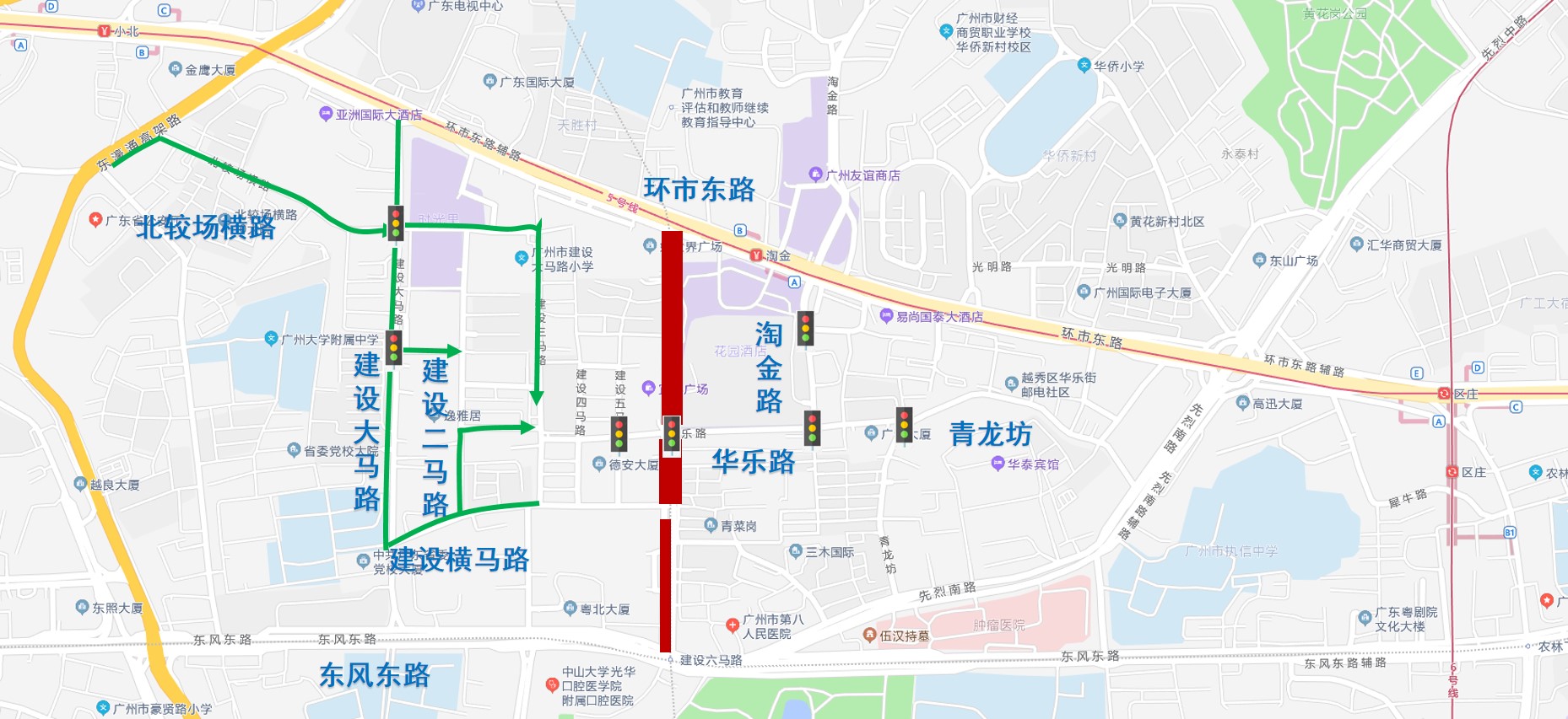 原建设六马路北往南过境车辆可通过小北路、建设大马路、淘金路-青龙坊、先烈南路、农林下路绕行;南往北过境车辆可通过农林下路、执信南路、黄华路、小北路绕行;