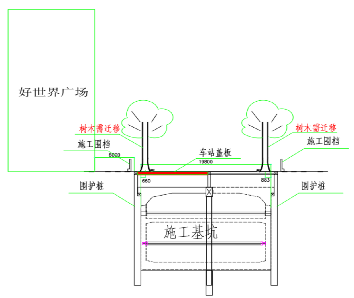 所谓盖挖法,就是先进行西侧的围护结构和顶板施工,东侧道路作施工场地。待西侧结构完工后,再利用西侧作施工场地,倒边进行东侧的围护结构和主体结构施工。