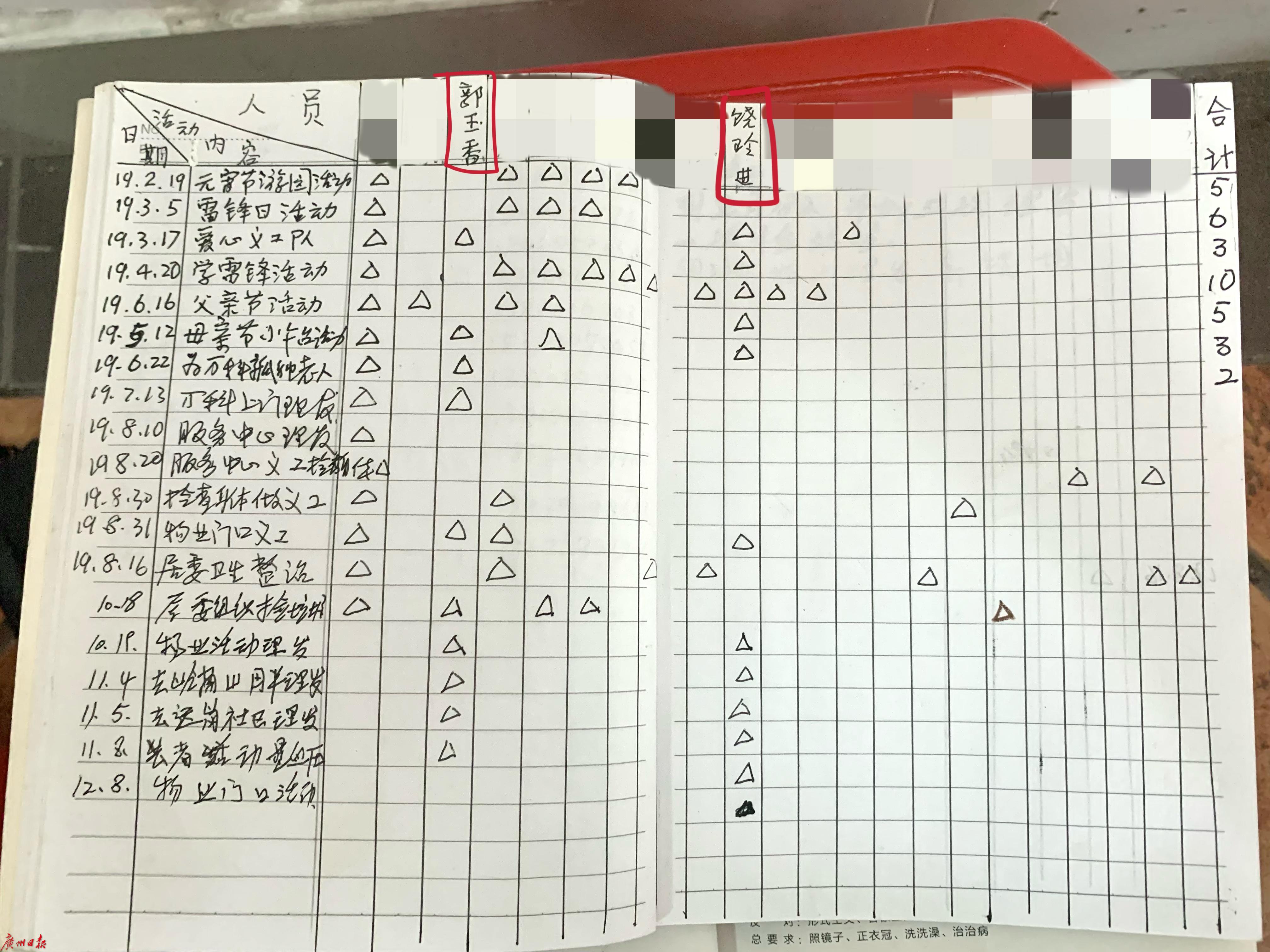 那本记录义剪服务的手册,还用“△”符号标记上曾参加过的活动。