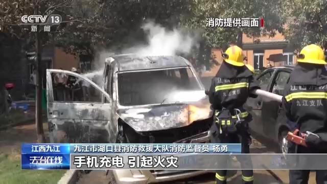 九江市湖口县消防救援大队消防监督员 杨勇:经过我大队对现场勘验,此起火灾是车主在车内暴晒的情况下,手机充电,引起火灾。