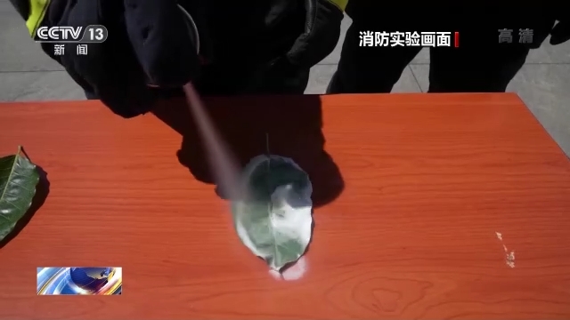 记者购买了三款销量靠前的此类产品,带到了重庆消防总队进行实验。烈日下,室外气温超过38℃,消防员将三款喷雾喷到新鲜树叶上,树叶表面温度很快降至0℃以下,并结出一层白霜。