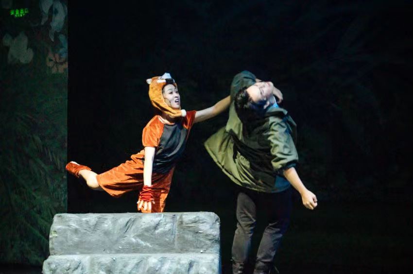舞台布景简洁,绿色森林的幕布背景从上往下铺满舞台。鸟鸣,天亮了,一曲《森林的清晨》响起。小动物们登场,唱起了《森林舞会》,“在茂密的森林里穿行,树梢点头向我们示意……这是一片神奇的森林,我们守护这一方净土。”一派和诣、宁静、欢乐。