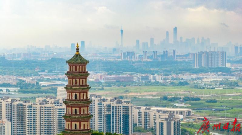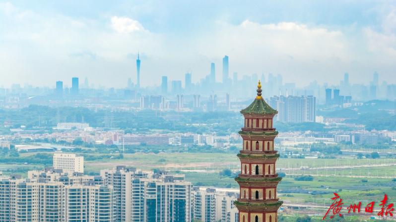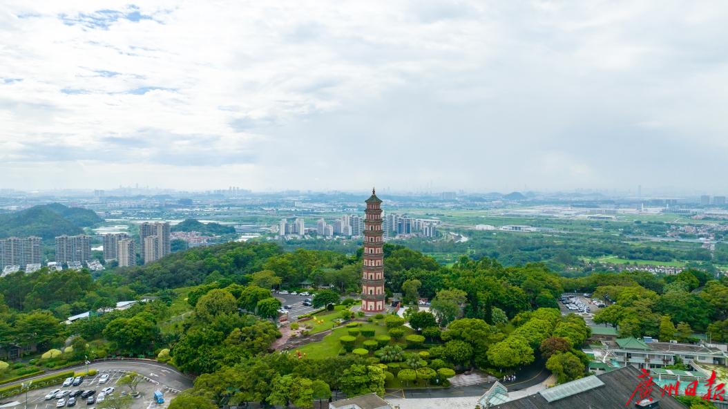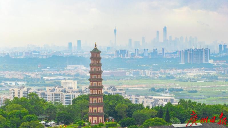 记者在莲花山顶航拍,20多公里外的广州塔、珠江新城CBD高楼出现在画面内,呈现广州塔、东塔、西塔、莲花塔“四塔同框”的绝美景观。