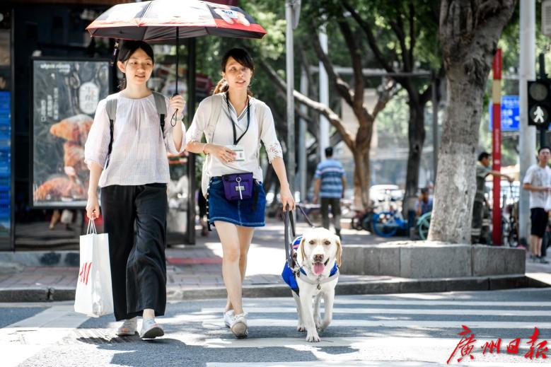 韦琳(左二)在她的导盲犬Alan带领下过马路