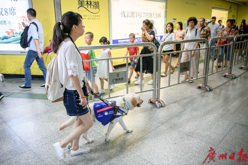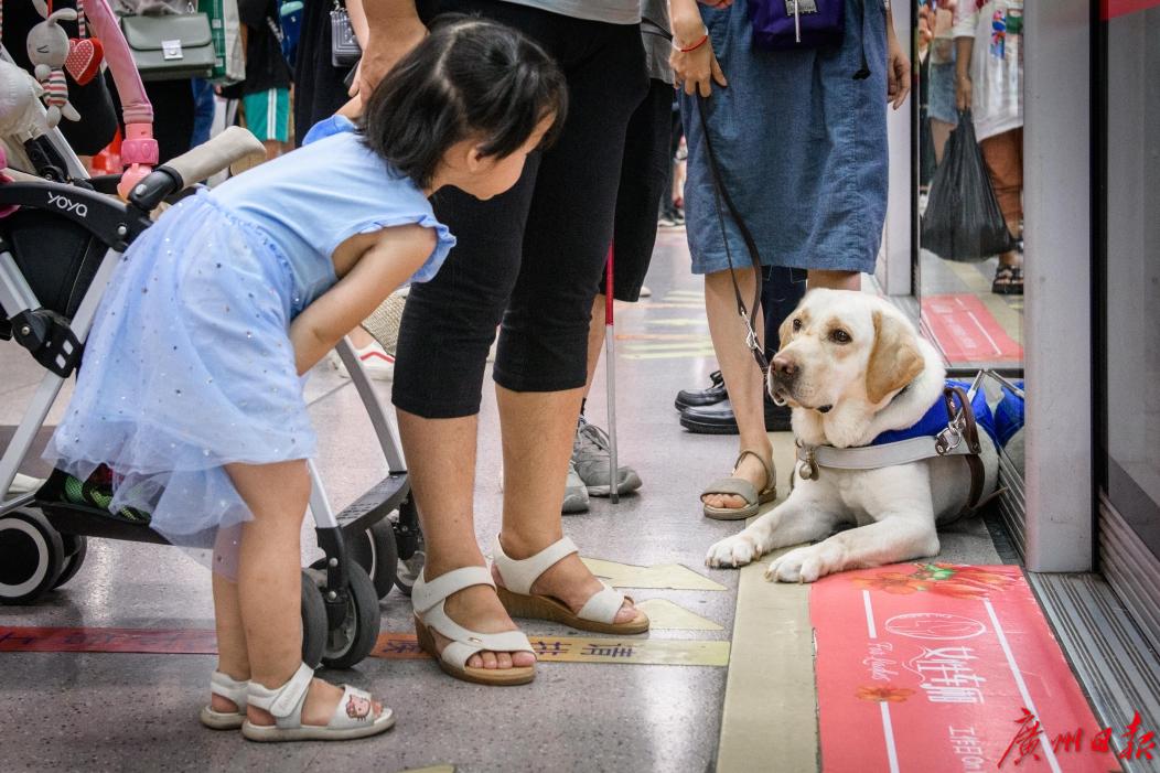 在等待地铁的过程中,导盲犬Alan安静地蹲在主人身边,面对小朋友的引逗,Alan毫不分心
