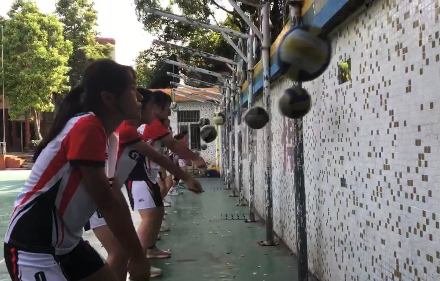 球场正对面的墙充满“历史感”,墙面上“刻苦锻炼、团结拼搏、力争上游”等大字已经脱色。平时,同学们就对着这面墙,自主练习垫球、传球、扣球等基本功。学校打响排球招牌,这面墙功不可没。