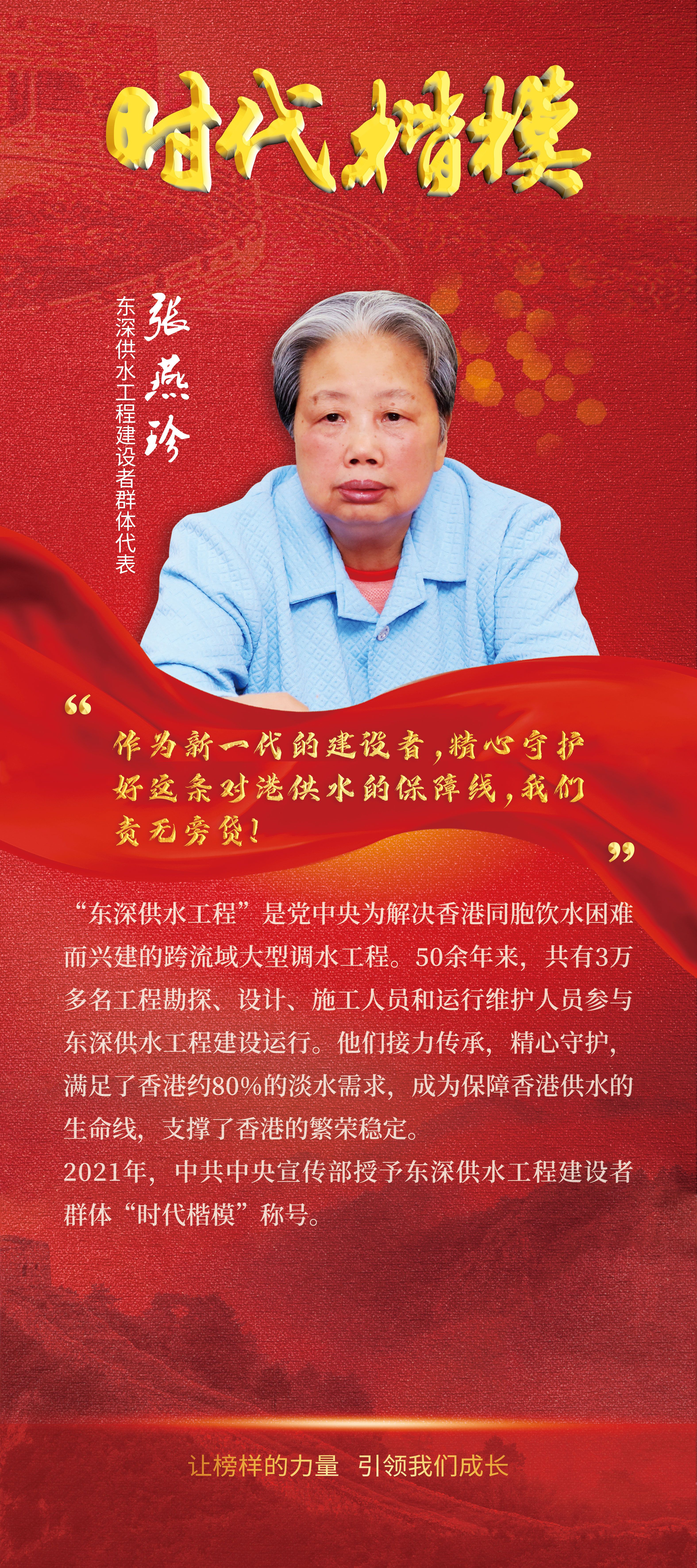 张燕珍在“同饮一江水 浓浓家国情”宣讲中讲述了东深供水工程那段“要高山低头,令河水倒流”、建造对香港供水线的奋斗故事。她表示,那段岁月虽然住茅棚,吃腐乳拌饭,劳作艰辛,但看到东深供水工程满足了香港约80%的淡水需求,为香港的繁荣稳定作出了不可替代的历史性贡献,她不禁为此感到深深地自豪,有感于人之坚毅,金石可镂。