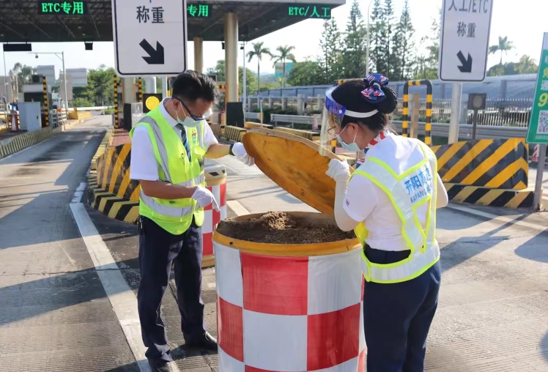 8月23日,开阳高速沿线各站员工检查现场水马、沙桶等交安设施。