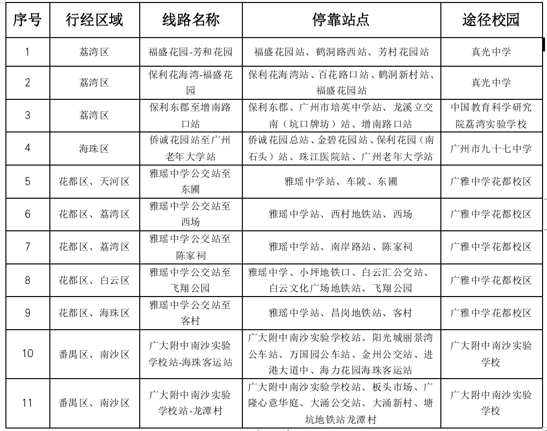 8月24日,记者了解到,广州巴士集团计划从八月末起,新开行11条定制公交线路,途经真光中学、九十七中等5所校园,线路信息如下: