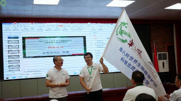 19日的开营仪式上,保护区管理局副局长束祖飞致辞时对学员们的到来表示欢迎和祝贺,并寄予了厚望,期望志愿者们能出色完成实训任务,讲好车八岭的生态故事,为促进“人与自然和谐共生”贡献自己的力量。随后,保护区管理局局长吴智宏为志愿者训练营授予营旗,并举行宣誓仪式。主办方还对2021年度优秀科普志愿者和先进科普工作者进行了表彰,为聘任的7名“车八岭自然科普博士导师团队”颁发了聘书,毕业于哈佛大学的叶建淮博士后(博士生导师)作为代表进行了发言。
