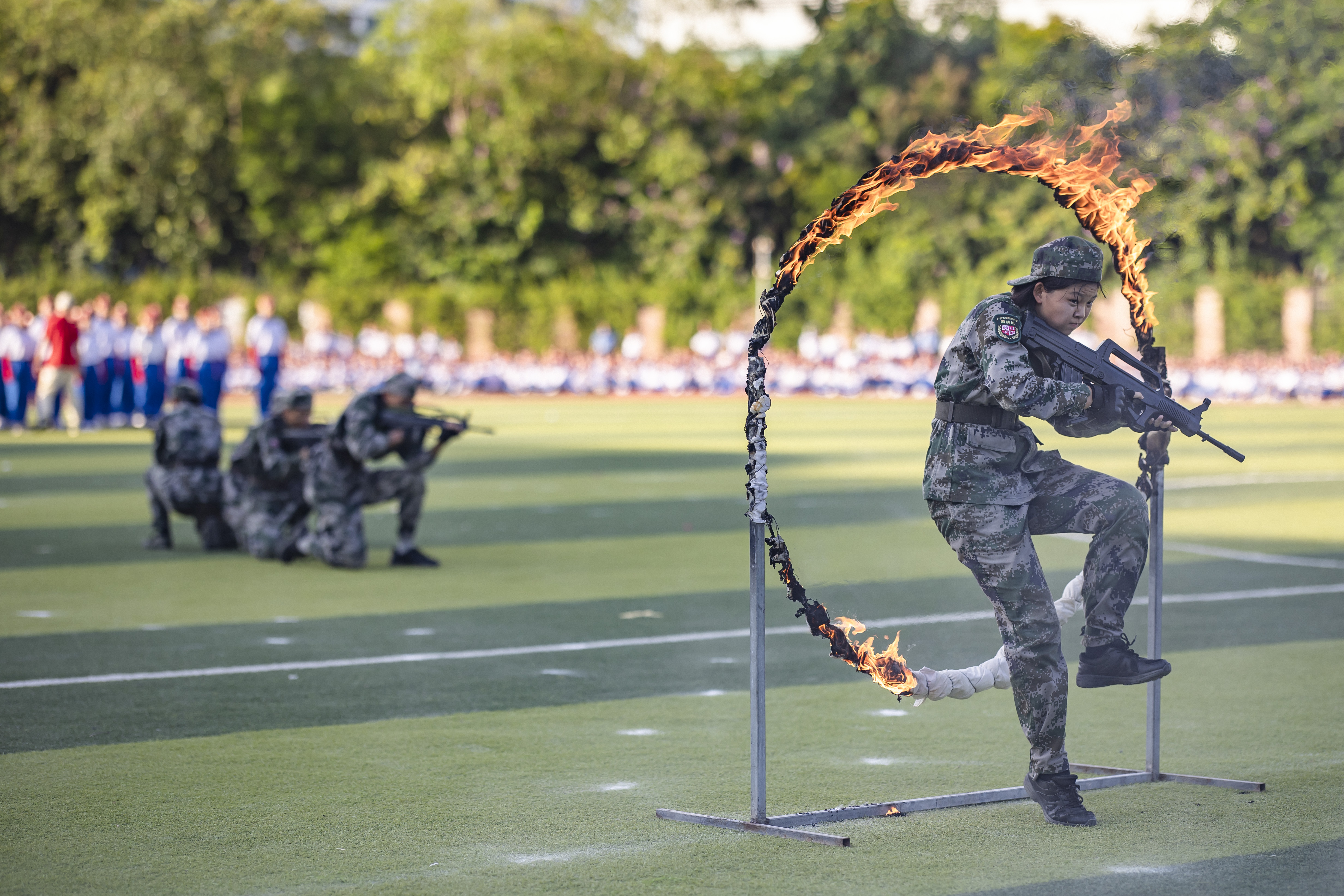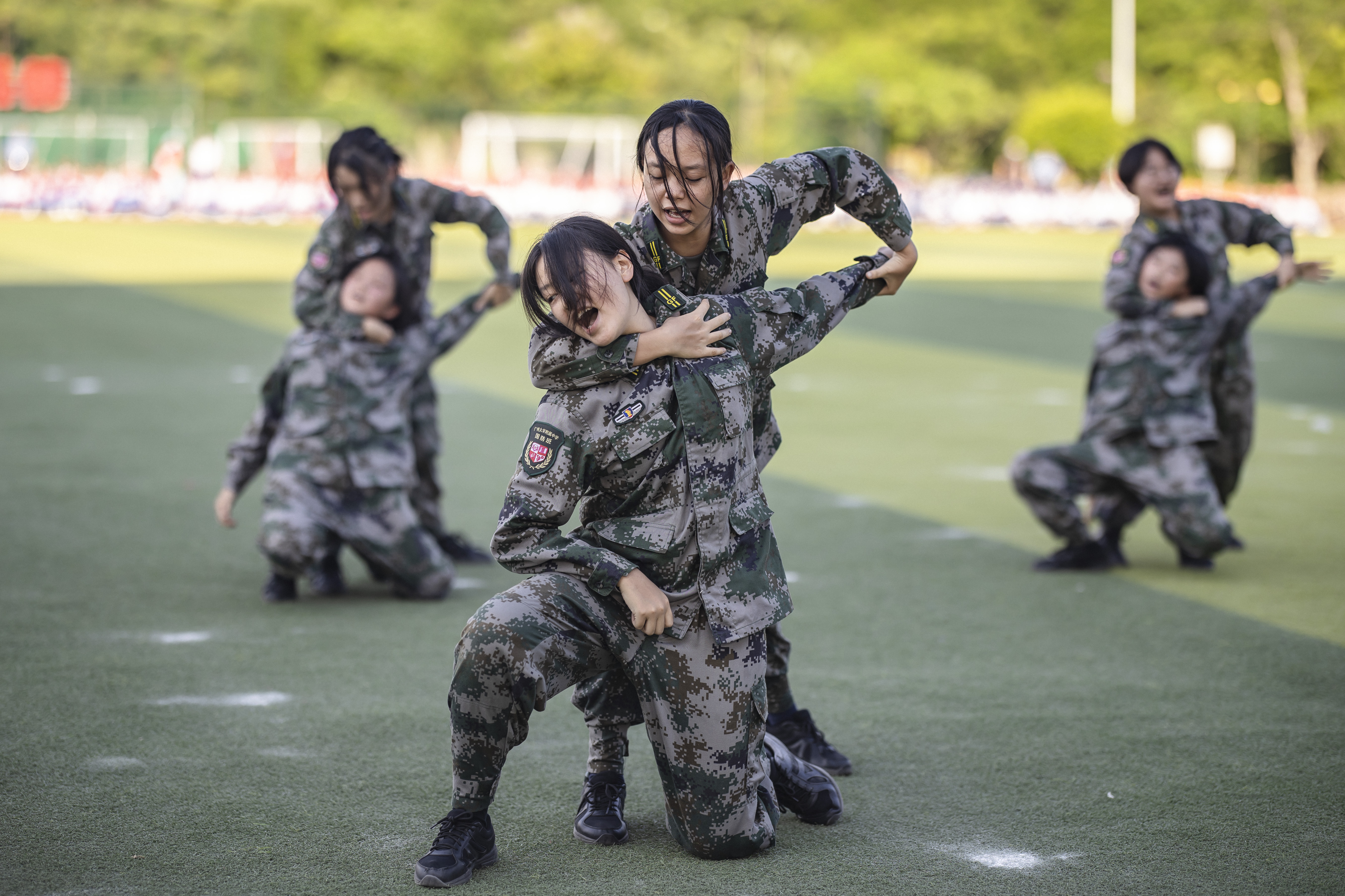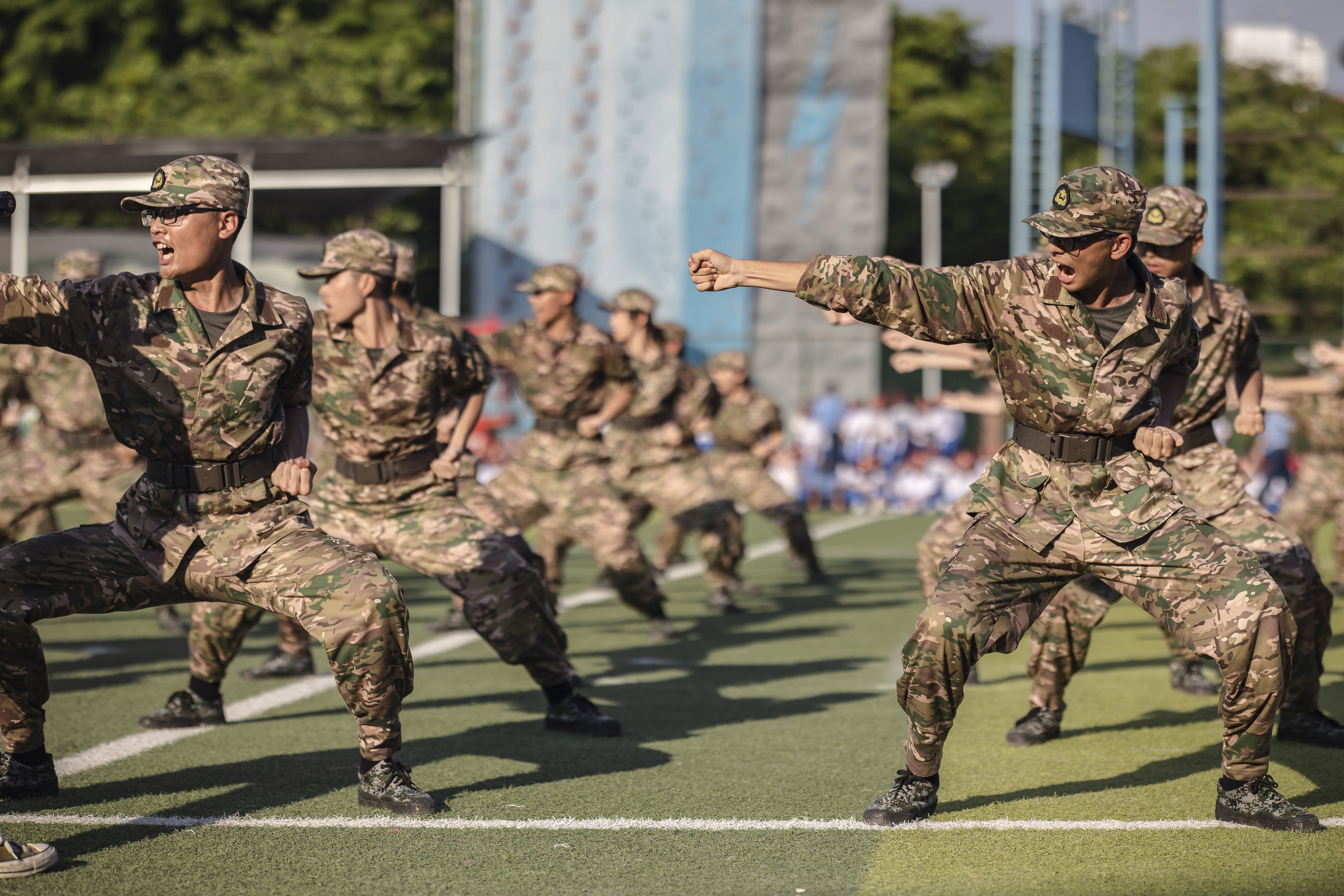 初三少军班的男生动作精练,齐做匕首操;高一国防班整齐划一,挥舞军体拳;高二国防班女生们展示了一套干净利落的搏击术,让人赞叹“巾帼不让须眉”;高二国防班的战术动作展示,展现了该校国防特色课程的成果。活动最后,广大附中大学城校区482名高一新生一起歌唱祖国,他们通过手语操和队列阵型的变化,表达对党和国家的热爱。