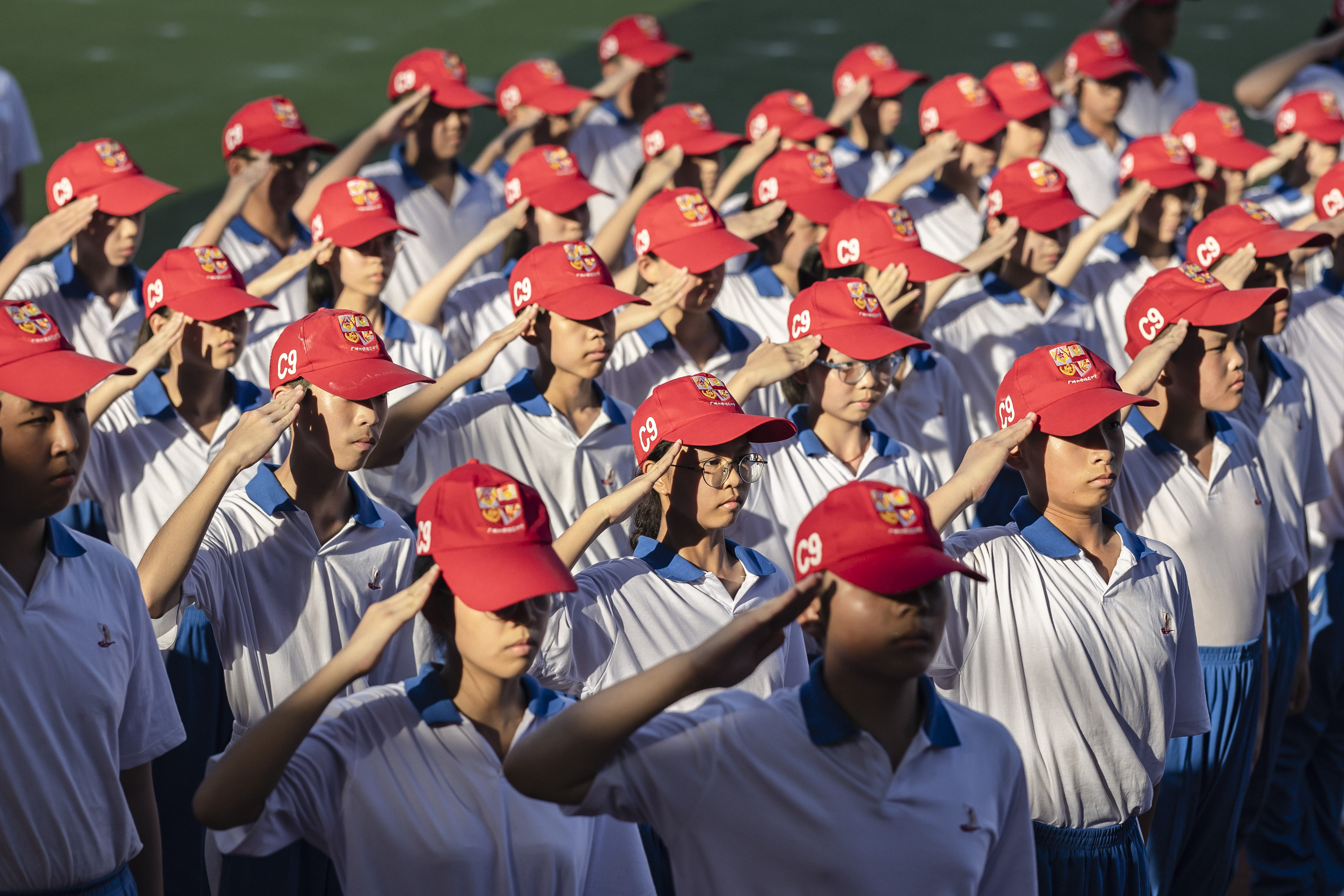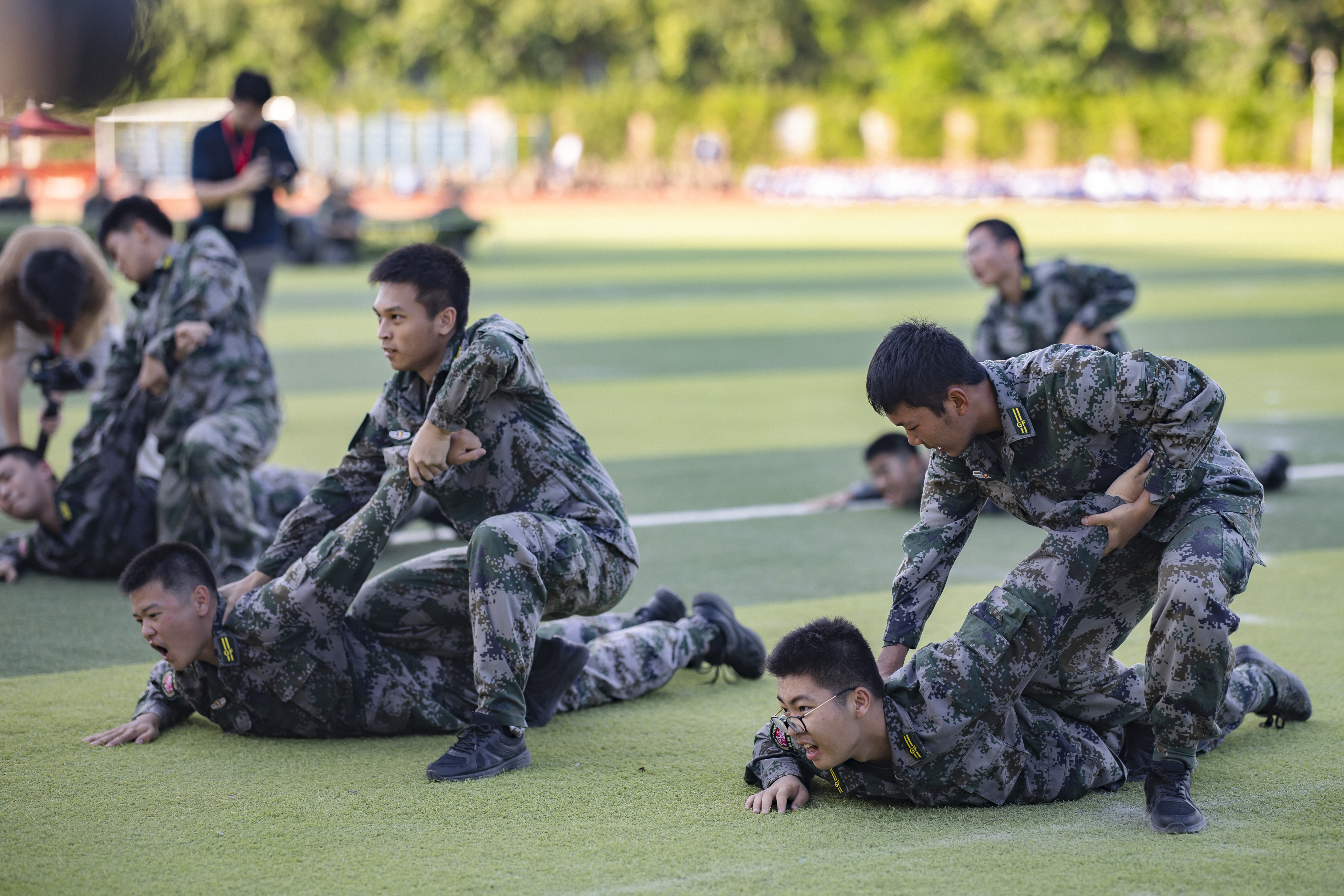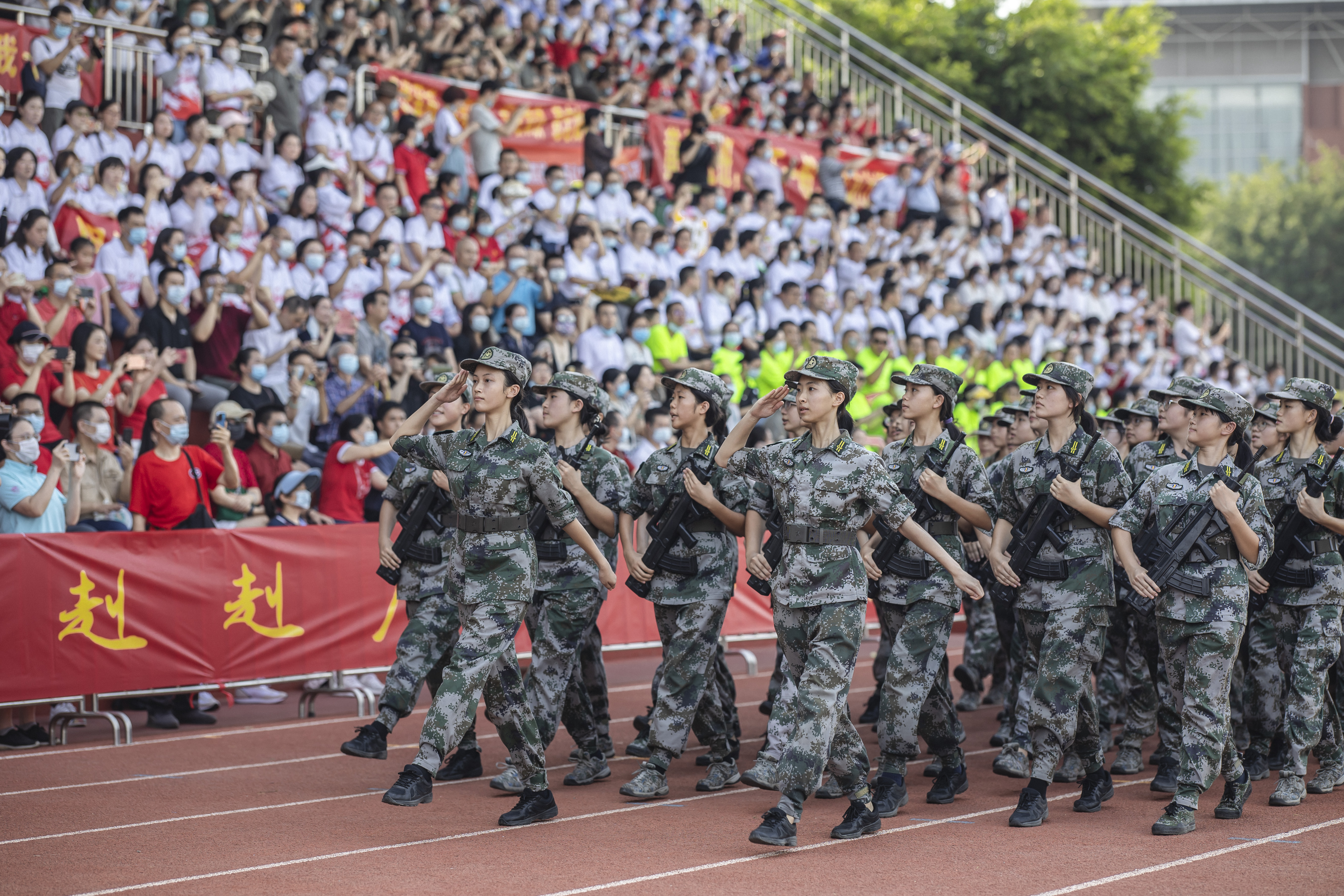 初三少军班的男生动作精练,齐做匕首操;高一国防班整齐划一,挥舞军体拳;高二国防班女生们展示了一套干净利落的搏击术,让人赞叹“巾帼不让须眉”;高二国防班的战术动作展示,展现了该校国防特色课程的成果。活动最后,广大附中大学城校区482名高一新生一起歌唱祖国,他们通过手语操和队列阵型的变化,表达对党和国家的热爱。