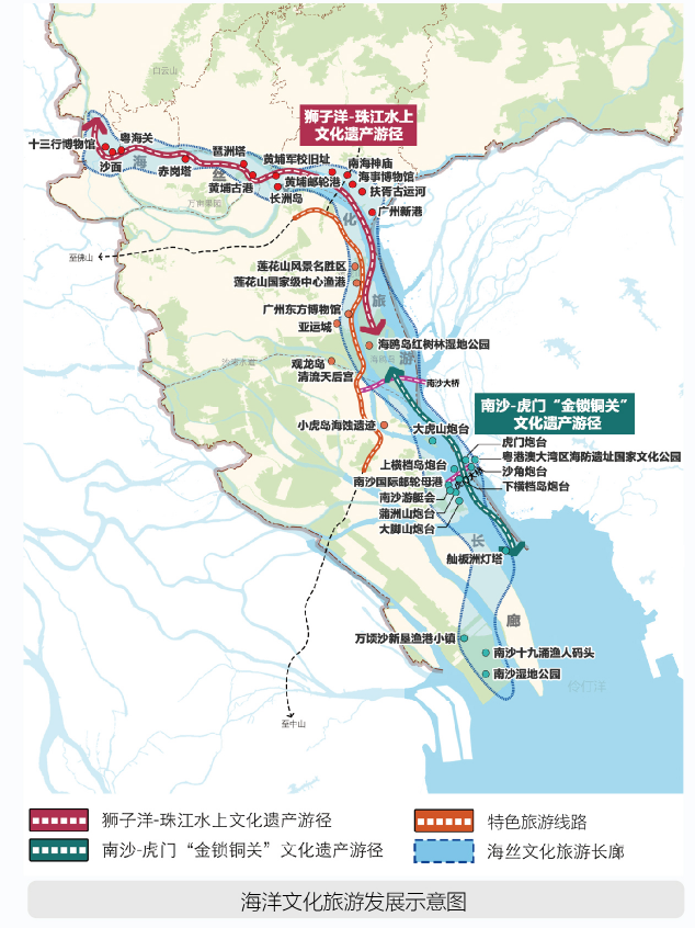 四是彰显海洋城市文化特色。保护活化海丝文化、海商文化、海防历史遗迹等海洋文化资源。重点打造十大海丝人文地标,包括十三行、黄埔古港、莲花塔、琶洲塔、赤岗塔、南海神庙、扶胥古运河、南越国宫署遗址、光塔、南沙天后宫等。形成十大海洋文旅新名片。包括沙面建筑群、粤海关旧址、文化公园水产馆、珠江国际慢岛(长洲岛-大吉沙-洪圣沙)、黄埔国际邮轮城、广州海事博物馆、莲花山中心渔港、南沙国际邮轮母港-大角山滨海公园、粤港澳大湾区海防遗址国家文化公园、南沙湿地公园-十九涌渔人码头等。