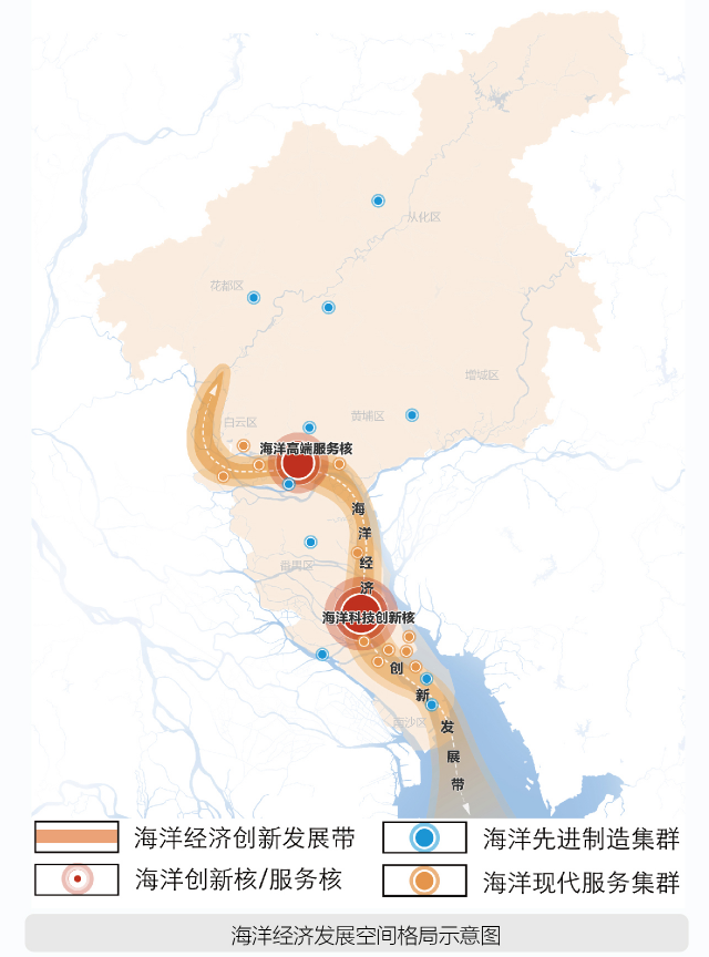 《规划》擘画了广州“十四五”时期海洋经济发展空间布局,提出构建“一带双核多集群”空间布局方案。打造沿江滨海的海洋经济创新发展带,串联以海珠区、黄埔区为中心的海洋高端服务核和以南沙区为核心的海洋科技创新核,重点发展船舶与海洋工程装备、海洋交通运输、海洋生物和海洋电子信息等特色海洋产业集群。