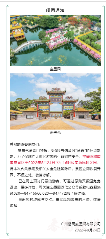 8月24日,广州番禺宝墨园有限公司发布了防台风临时闭园通告:受第9号强台风“马鞍”的环流影响,为了保障广大市民游客的生命财产安全,宝墨园和南粤苑景区于2022年8月24日16时起实施临时闭园,待本次台风暴雨及相关安全危险解除后,景区立即恢复开园。 已在网上预订门票的游客,可通过原购买渠道免费退改,更多详情,可关注宝墨园微信公众号或致电客服热线020—84746666,020—84747238了解详情。