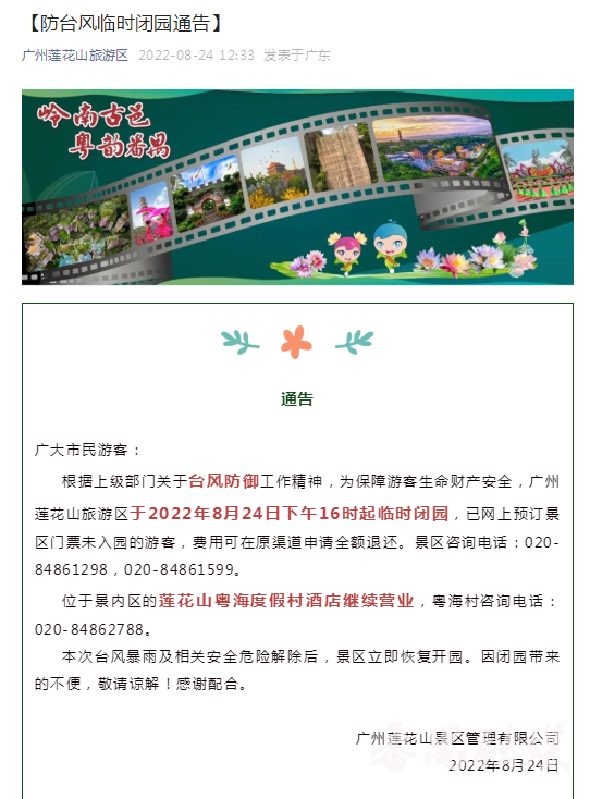 8月24日,广州莲花山景区管理有限公司发布了防台风临时闭园通告:根据上级部门关于台风防御工作精神,为保障游客生命财产安全,广州莲花山旅游区于2022年8月24日16时起临时闭园,已网上预订景区门票未入园的游客,费用可在原渠道申请全额退还。景区咨询电话:020-84861298,020-84861599。位于景内区的莲花山粤海度假村酒店继续营业,粤海村咨询电话:020-84862788。本次台风暴雨及相关安全危险解除后,景区立即恢复开园。
