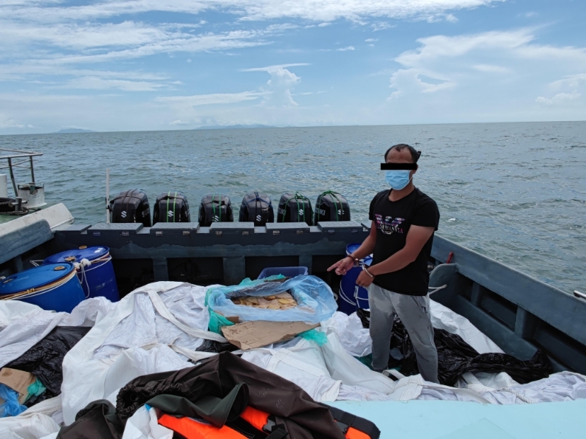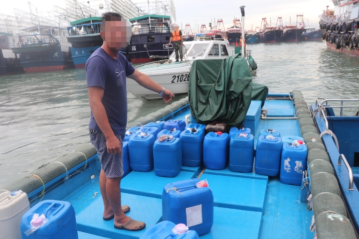 当天16时许,阳东工作站执法员在巡逻过程中再次查获一艘 “三无”蓝色快艇。截获该船后,执法员在船上查获成品汽油30桶,共计约750升。该艇驾驶人无法提供驾驶证件及船舶相关证件,疑似是专为走私船舶进行海上加油的服务船,执法员遂依法对该批汽油及涉案人员、船舶进行扣留以做进一步调查。
