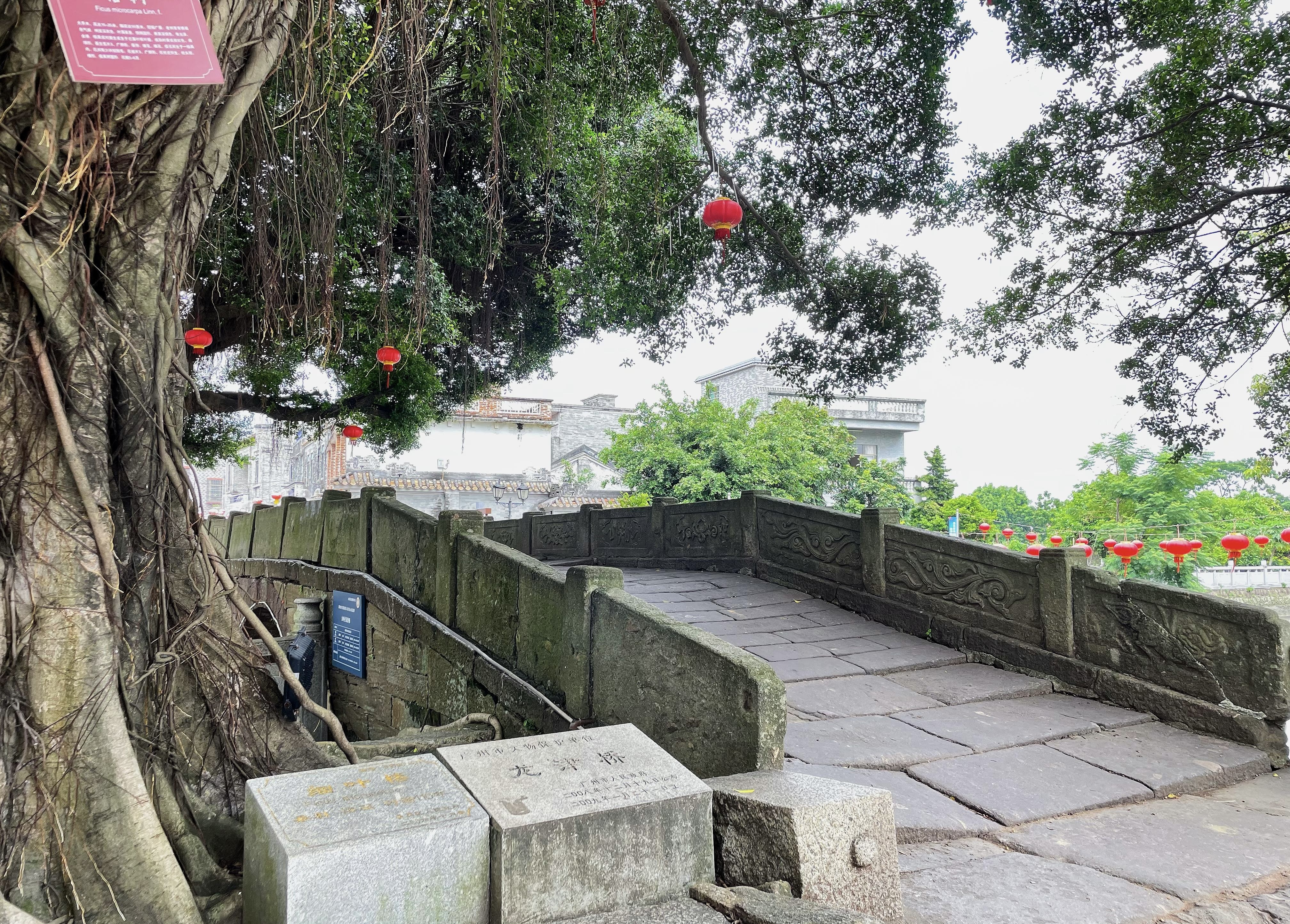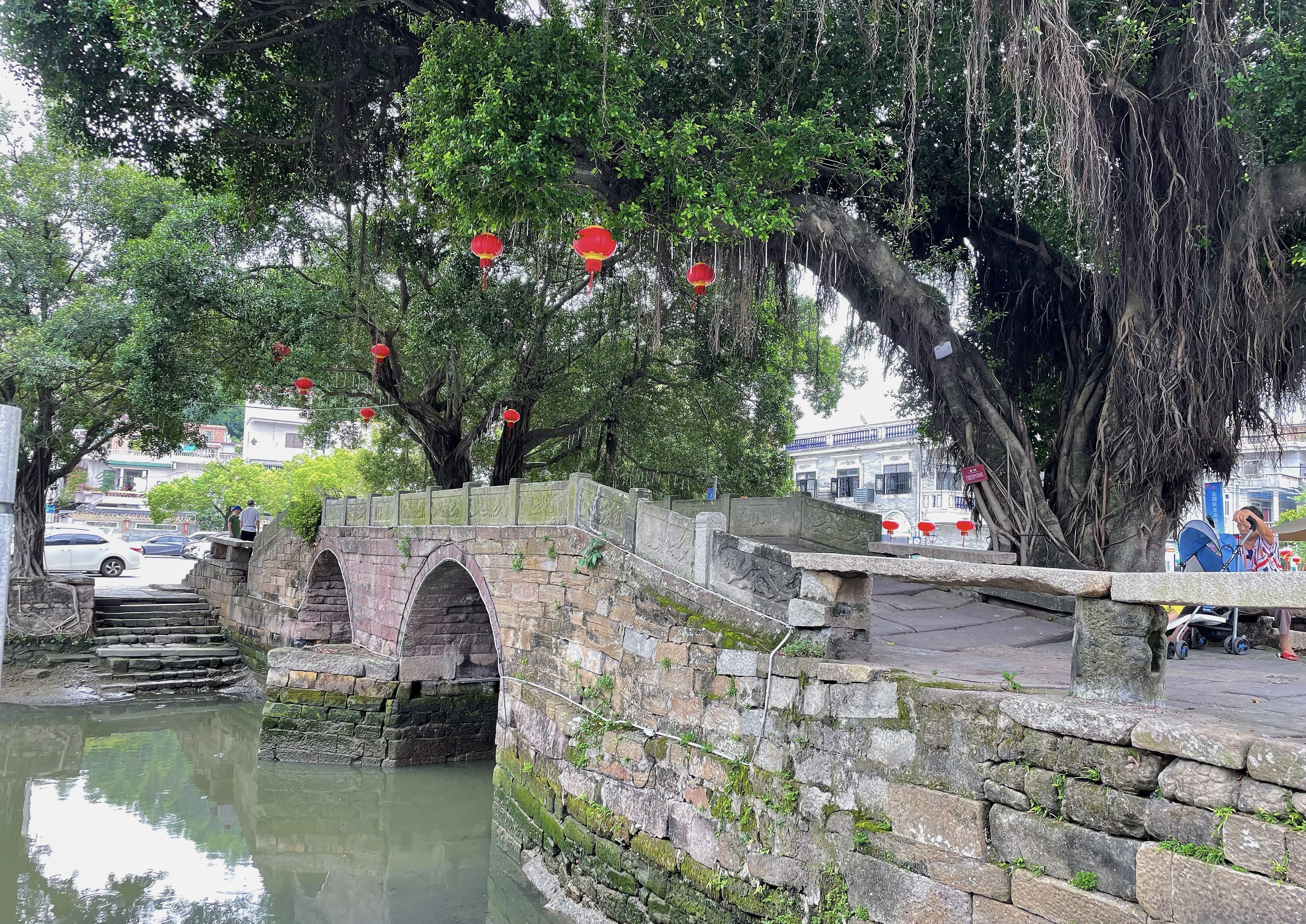 记者来到龙津桥见到,阳光下,玉带河水从桥下缓缓流过,微风拂过,波光粼粼,桥的周边挂满了喜庆的灯笼,拱出来的桥面上,有三两村民坐在石凳上乘凉,也有一群小孩在玩耍,更有老人拄着拐杖走上桥头看风景。桥旁的榕树宛如一座大伞守护着周围,画面尽显岁月静好。