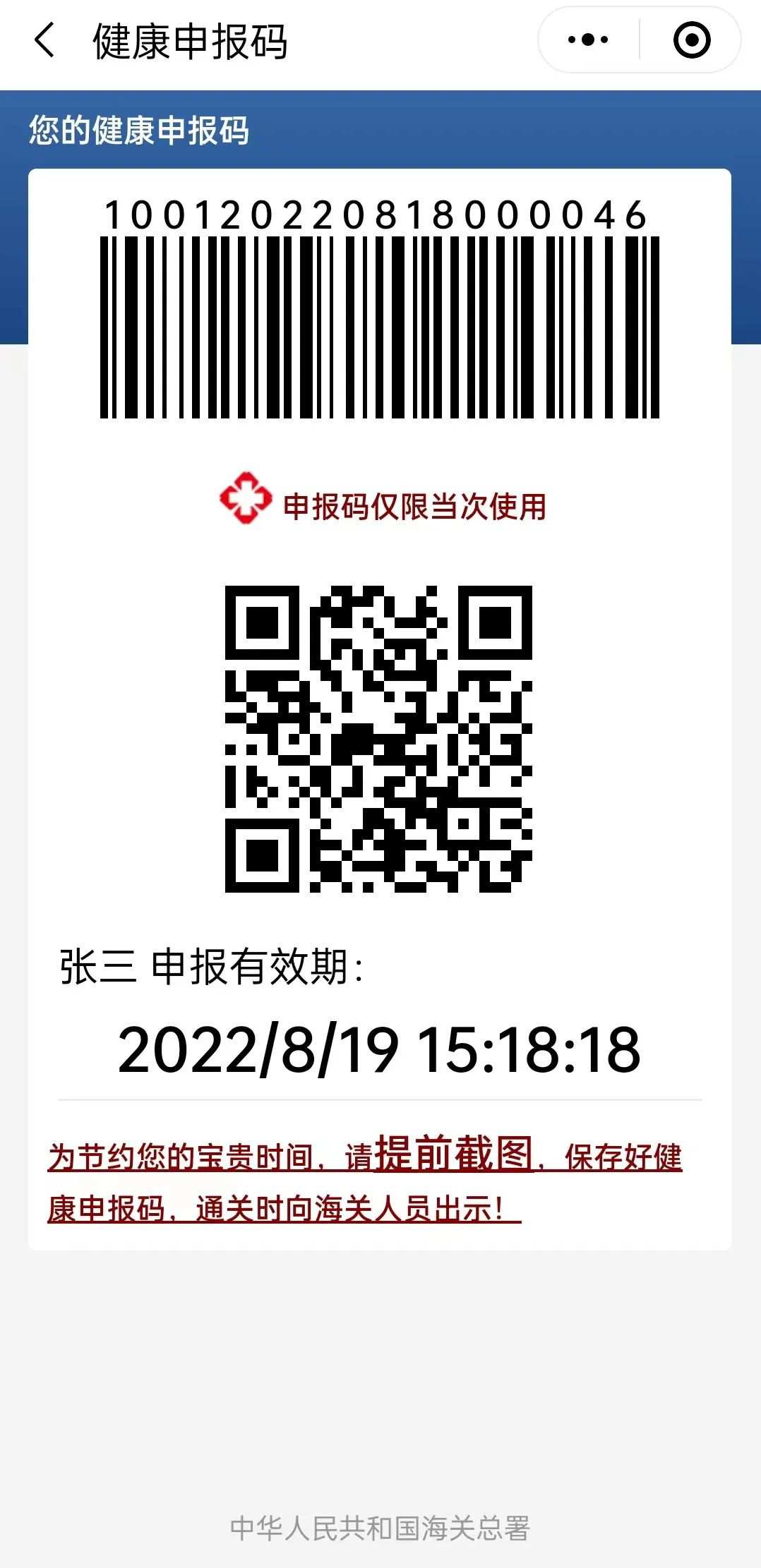 提交后将立即生成申报码,请截图保存至手机,并在通关时提前准备好向海关人员出示。