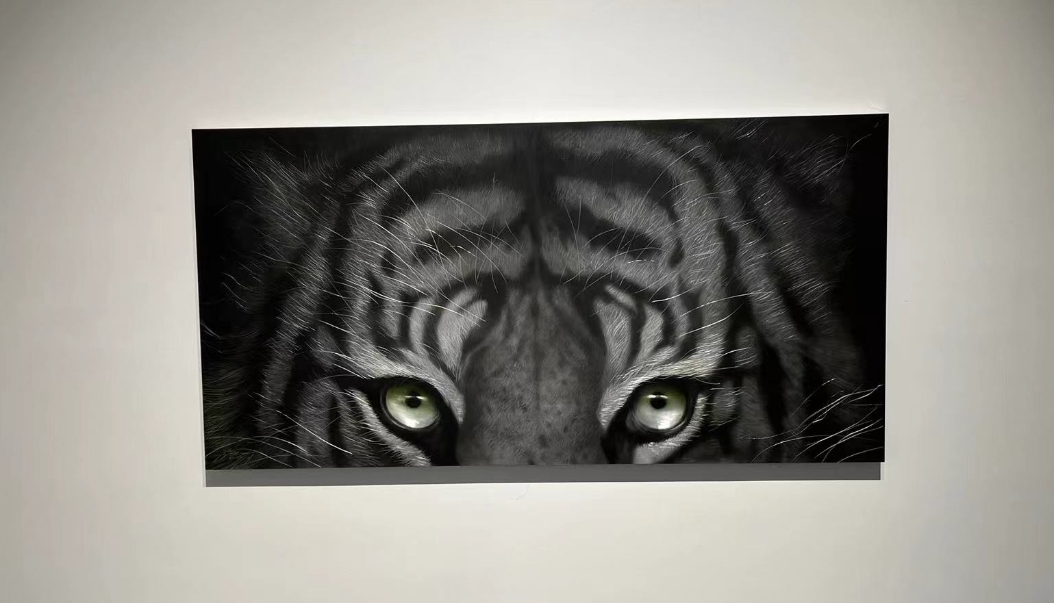 韩国艺术家姜亨九因为其超写实主义的肖像作品而被人熟知,他擅长以极写实的手法创作肖像画,其对肖像画常年如一的执着,并将肖像画推进至极度写实又极端虚构的边缘地带,这样独特的创造方式令他在肖像画领域独树一帜。此次展出的《自画像》和《虎灵》,作品中的人物或物象以强烈的眼神与面对作品的观众对视,在艺术家本人看来,“也是与自己的对话”。