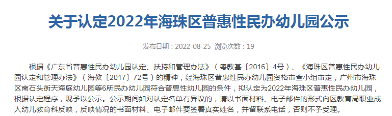 公告显示,根据相关文件精神,经海珠区普惠性民办幼儿园资格审查小组审定,广州市海珠区南石头街天海庭幼儿园等6所民办幼儿园符合普惠性幼儿园的条件,拟认定为2022年海珠区普惠性民办幼儿园,根据认定程序,予以公示。公示期间如对认定名单有异议的,以书面材料、电子邮件的形式向区教育局职业成人幼儿教育科反映,反映情况的书面材料、电子邮件要签署真实姓名,并留联系电话,否则不予受理。