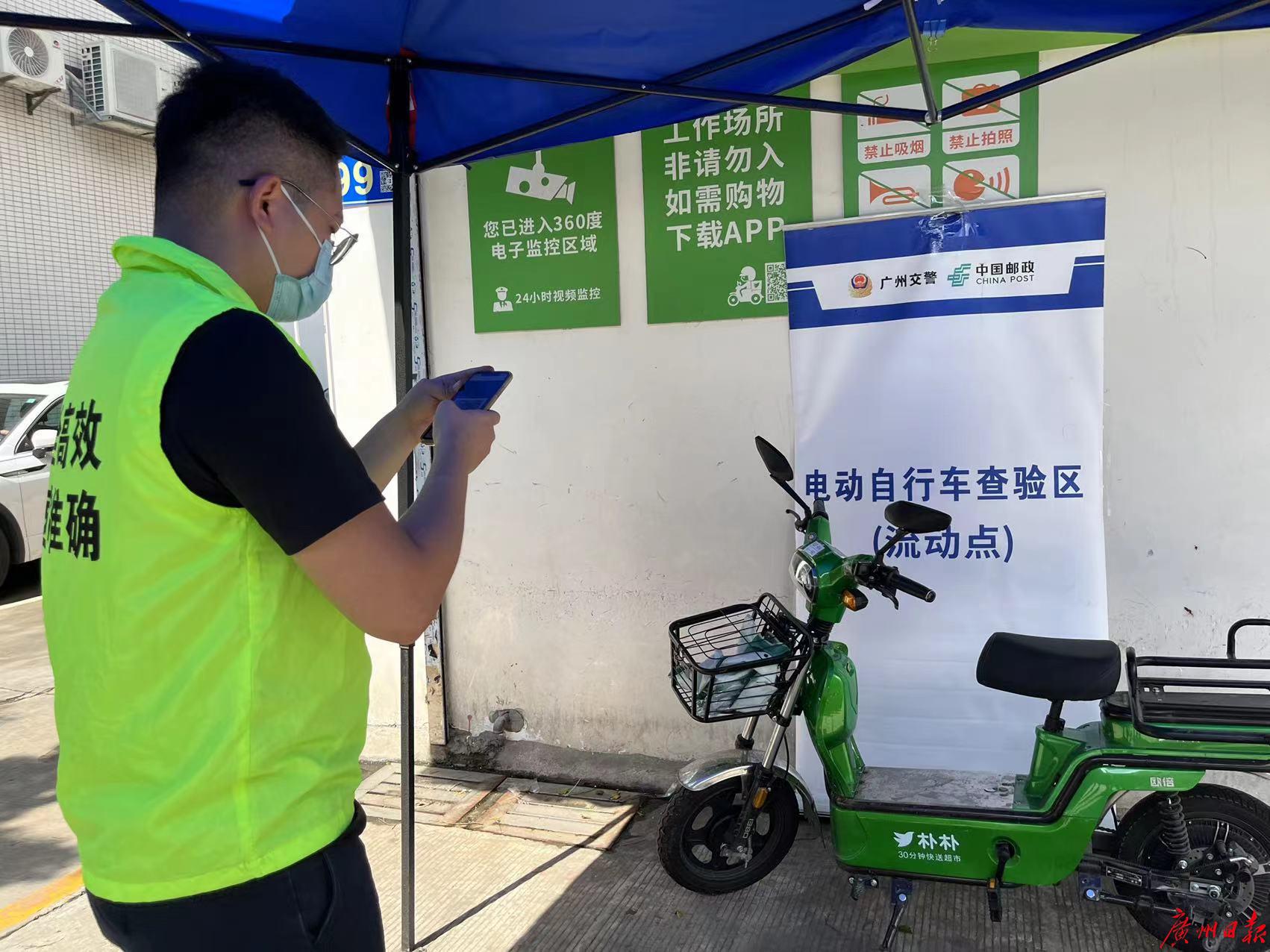 8月26日,在海珠区荔福路附近,广州邮政政企中心工作人员上门为某个超市门店的外卖电动自行车提供上牌服务。工作人员对车辆逐一进行核验后,为35辆电动自行车安装了号牌。