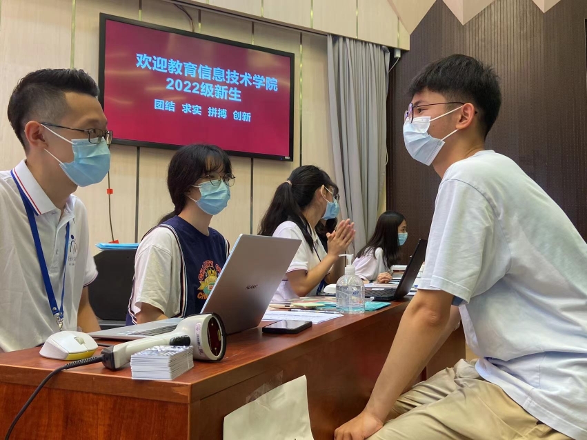 华师教育信息技术学院新生辅导员冯老师告诉记者,为做好疫情防控工作,学院事先安排新生尽量分批次分时段报到,以避免人员聚集。