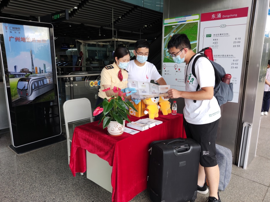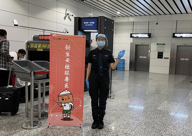 新生安检服务区在线答疑。考虑新生多为初次来穗,机场北站、广州南站、广州火车站、广州东站重点口岸站安检点处专门设置了“新生安检服务区”,安排专人指引和协助到穗乘客及时了解“戴口罩、测体温和亮码”进站乘车及过安检等地铁防疫和出行安全知识,让乘客安心出行。