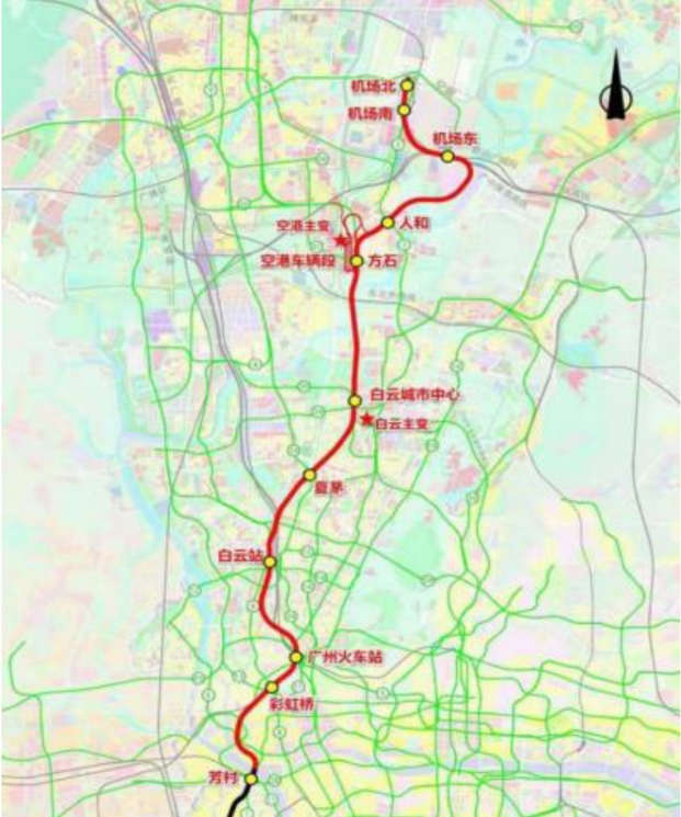 广州地铁介绍,芳白城际起自地铁22号线终点芳村站(在建),经荔湾区、越秀区、白云区、空港经济区至白云机场的机场北站,线路全长41.1公里,设站10座,均为换乘站。线路采用8节车厢列车,分快慢线运营,设计时速160公里,与定位为高速地铁的22号线一致。