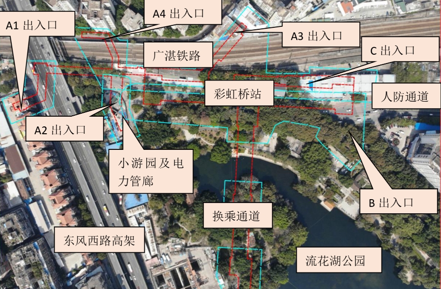 芳白城际彩虹桥站位于流花湖公园西侧、广湛铁路东侧、东风西路北侧,处于流花路正下方,西南-东北向布置,设出入口6个。车站将采用明挖法施工,原结构尺寸253米*24.9米*45米,场地现状内有220KV电缆等管线穿过主体结构开挖范围。根据现场踏勘与权属单位意见咨询,该电缆无法迁改。