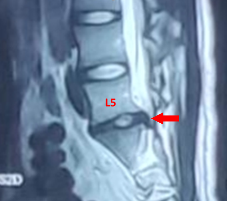 红色箭头:突出的L5/S1椎间盘