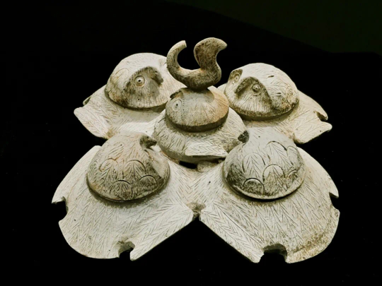 “百变鸮小”原型是2020年在广州市荔湾区广钢新城出土的汉代陶鸮形五联罐,由四个大罐和中心一小罐共五个罐组成,各罐以泥梁相连,内部不相通。五罐造型均仿鸮形像,盖为鸮首。联体罐流行于汉代岭南地区,是越文化的典型器物,应该是用来盛放果品、调料之类餐食。