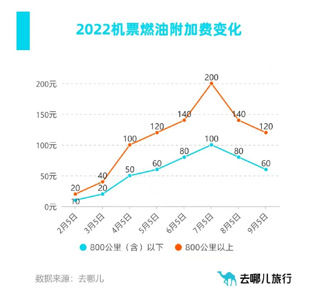 8月31日,同程旅行、去哪儿网站收到多家航空公司通知,自2022年9月5日起,国内800公里以下航段每位旅客收取燃油附加费60元,800公里以上航段每位旅客收取燃油附加费120元。