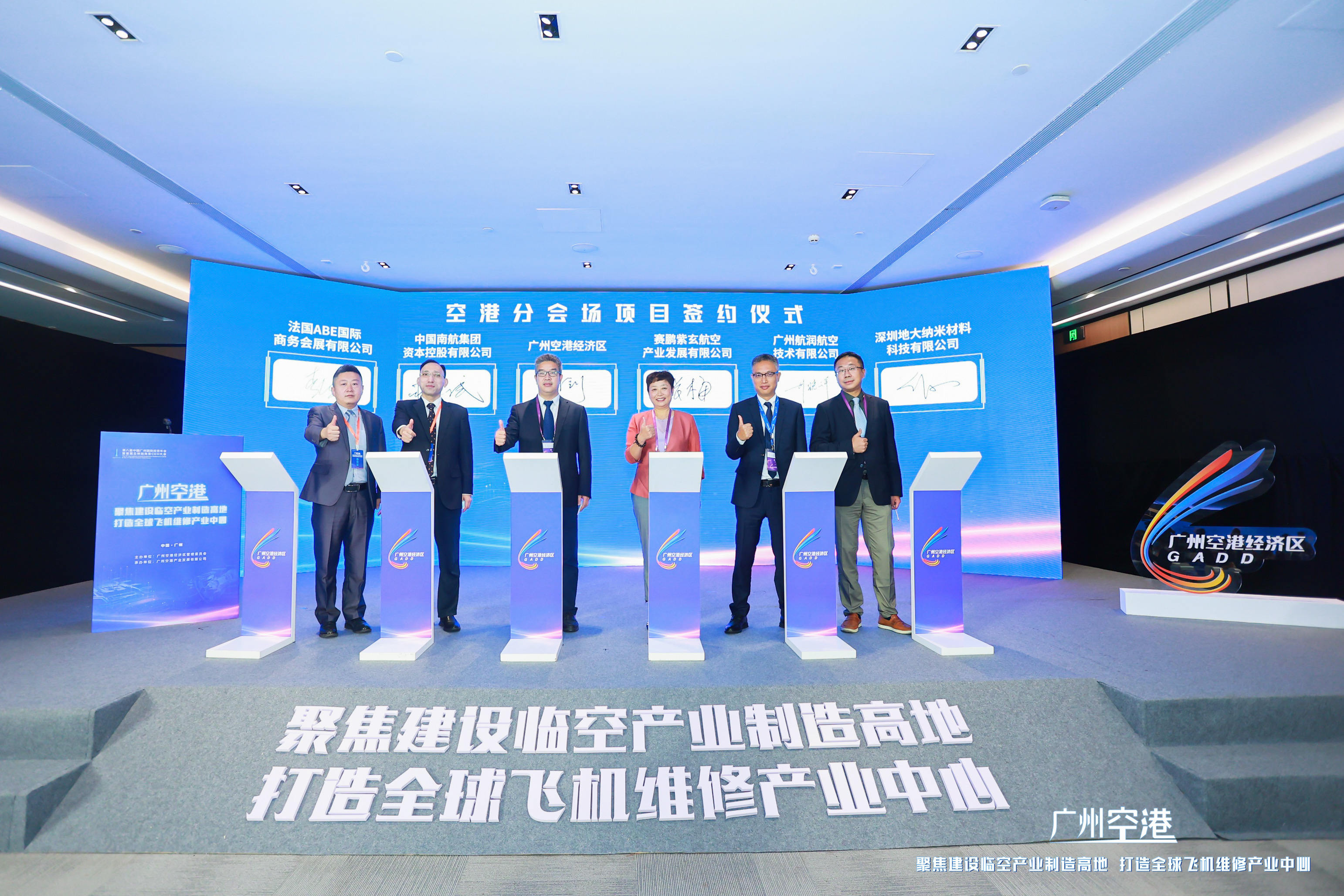 据了解,本次签约项目包括南航资本控股项目(中国南航集团资本控股有限公司投资)、飞机客改货全球总部基地(赛鹏紫玄航空产业发展有限公司投资)、大湾区航空资产管理和维修总部(广州航润航空技术有限公司投资)、地大航空发动机热障涂层总部基地(深圳地大纳米材料科技有限公司投资)、广州国际航空维修工程及地面服务展洽会项目(法国ABE国际商务会展有限公司投资),预计总投资额近60亿元,主要聚焦航空维修与制造产业链整合发展,加快形成一批高端制造业集聚区域,聚力打造广州临空经济发展新引擎。