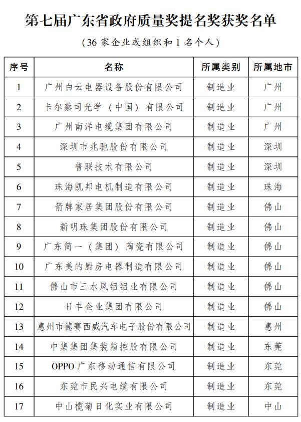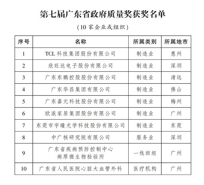 9月1日,在“质量月”活动启动之际,第七届广东省政府质量奖名单正式公布,10家企业或组织获得“第七届广东省政府质量奖”,36家企业或组织、个人获得“第七届广东省政府质量奖提名奖”。其中,广州市共有12家组织获奖,包括3家为省政府质量奖组织,9家为省政府质量奖提名奖组织,质量奖和质量奖提名奖获奖数量均居全省第一。