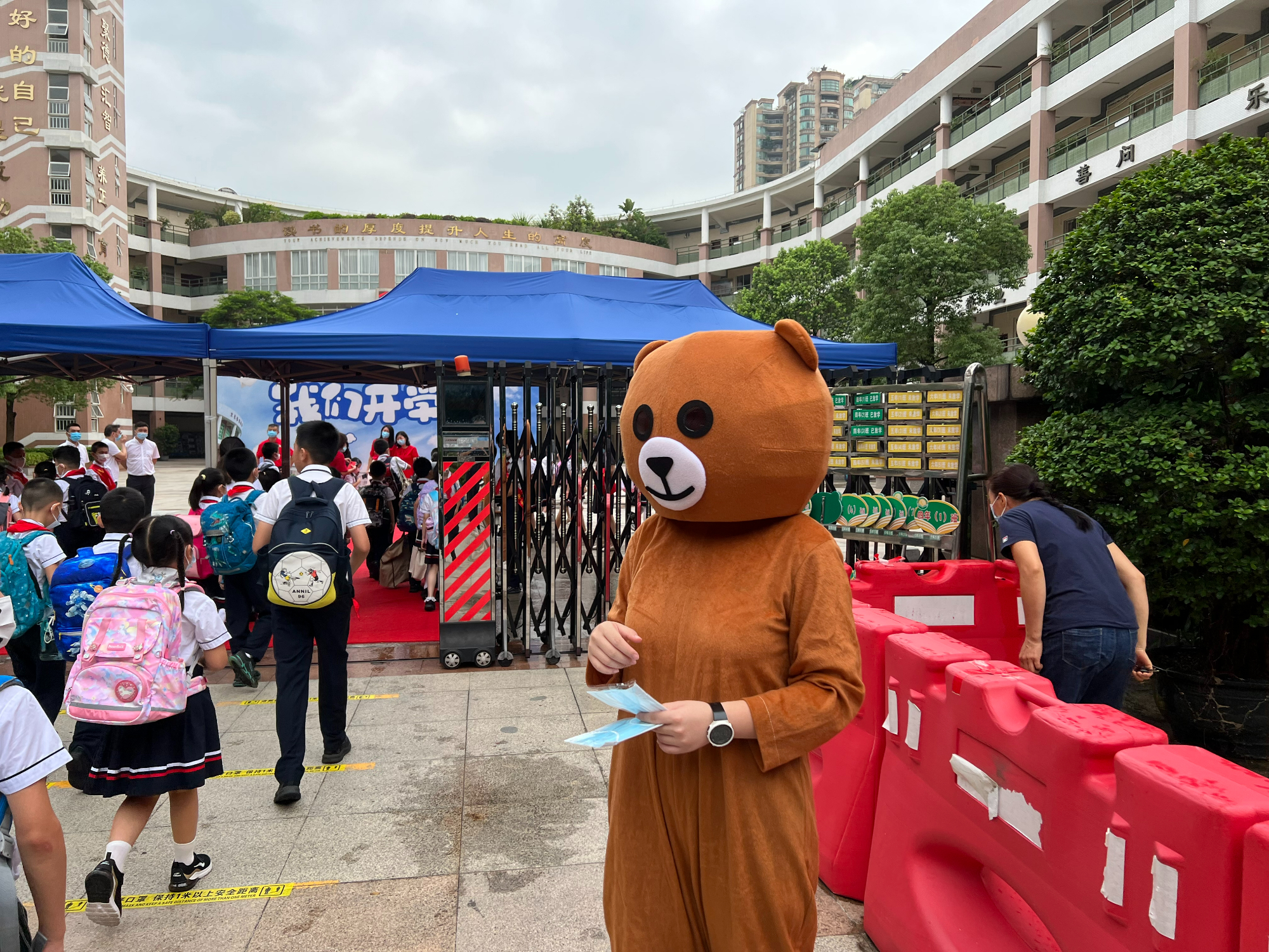 初二的学生杨同学穿着公仔给小学的同学们发口罩,她说,这样让同学们感觉更亲切。