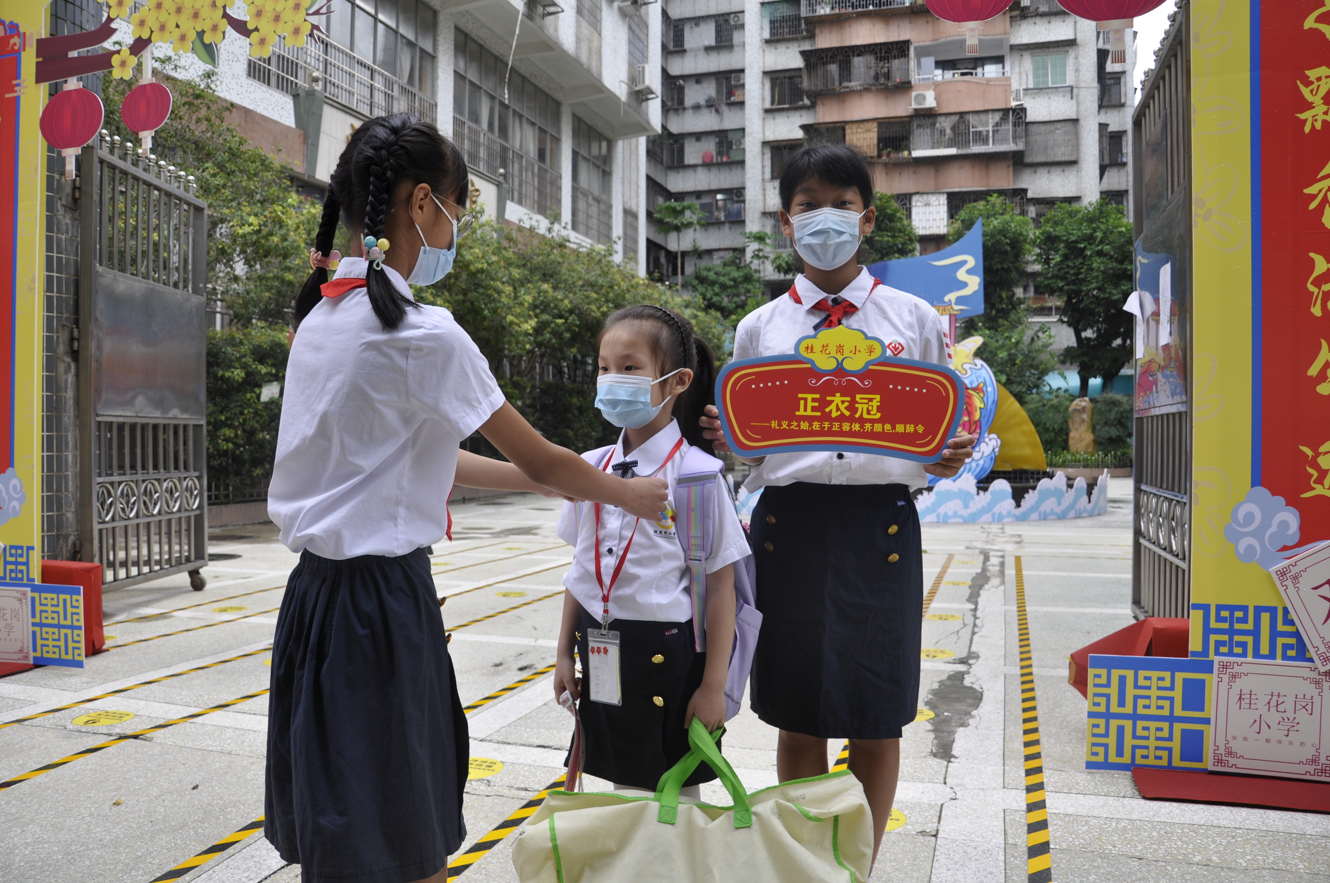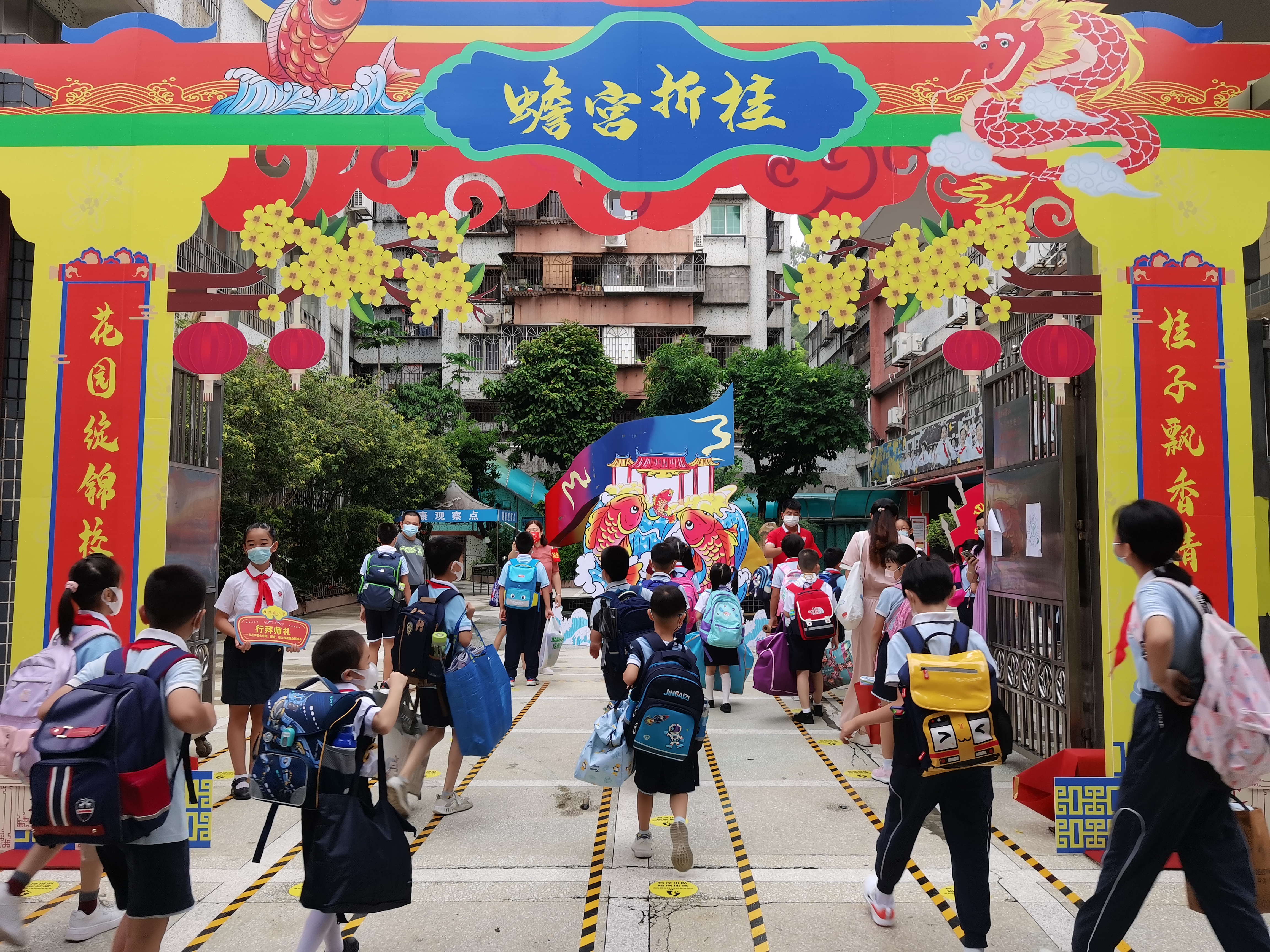 “强国路”、蟾宫折桂门、鱼跃龙门造型……越秀区桂花岗小学融入中华传统文化,精心设计入学报到环节。同学们入门前首先要正衣冠,规范佩戴好红领巾,接着逐步行拜师礼,击鼓明志,走过布置了天宫一号、神舟八号等模型的“强国路”,沾福折桂,踏出的每一步,都有满满的仪式感。