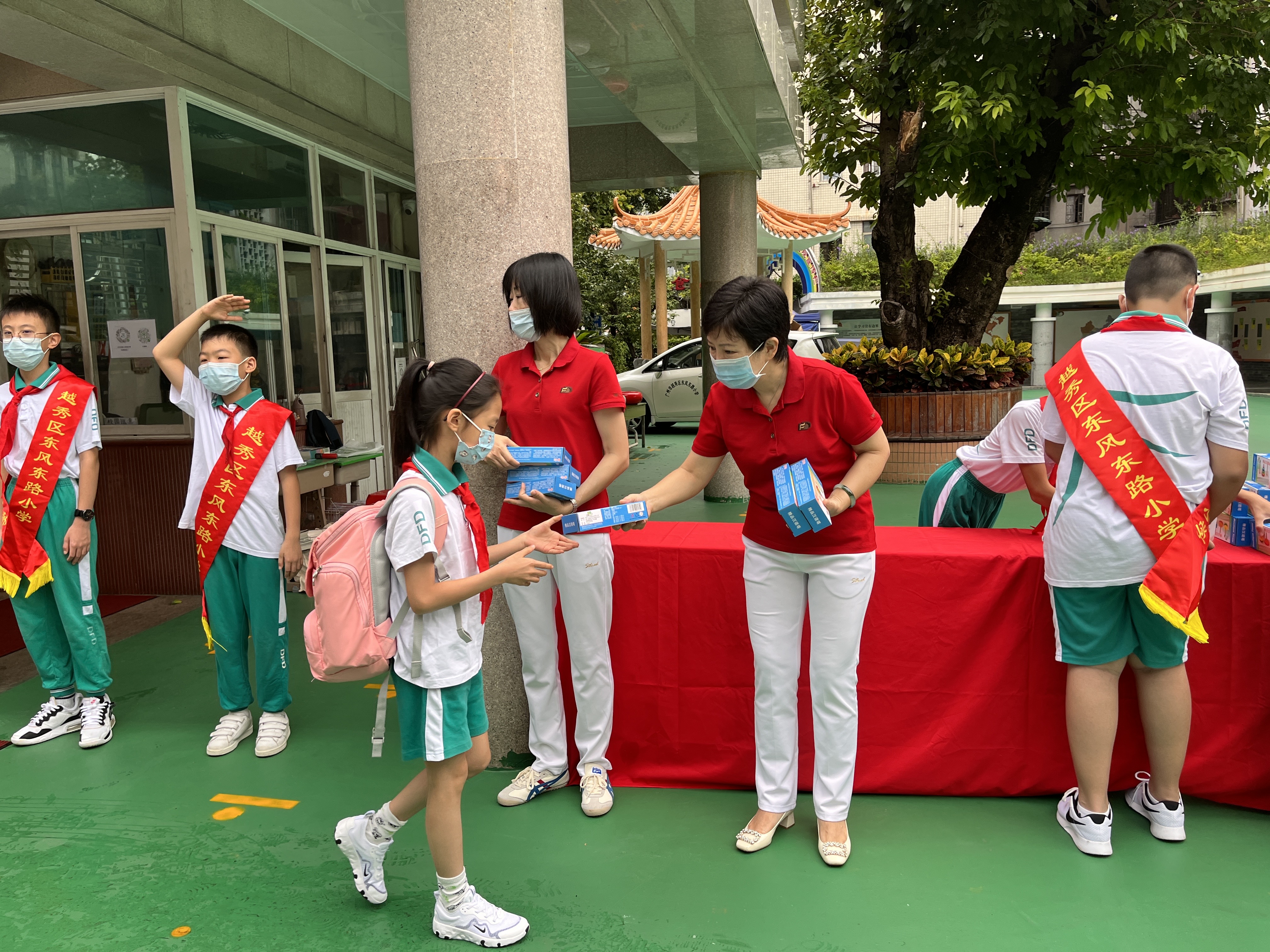 校长彭娅在校门口迎接同学们,送上一份份礼物。