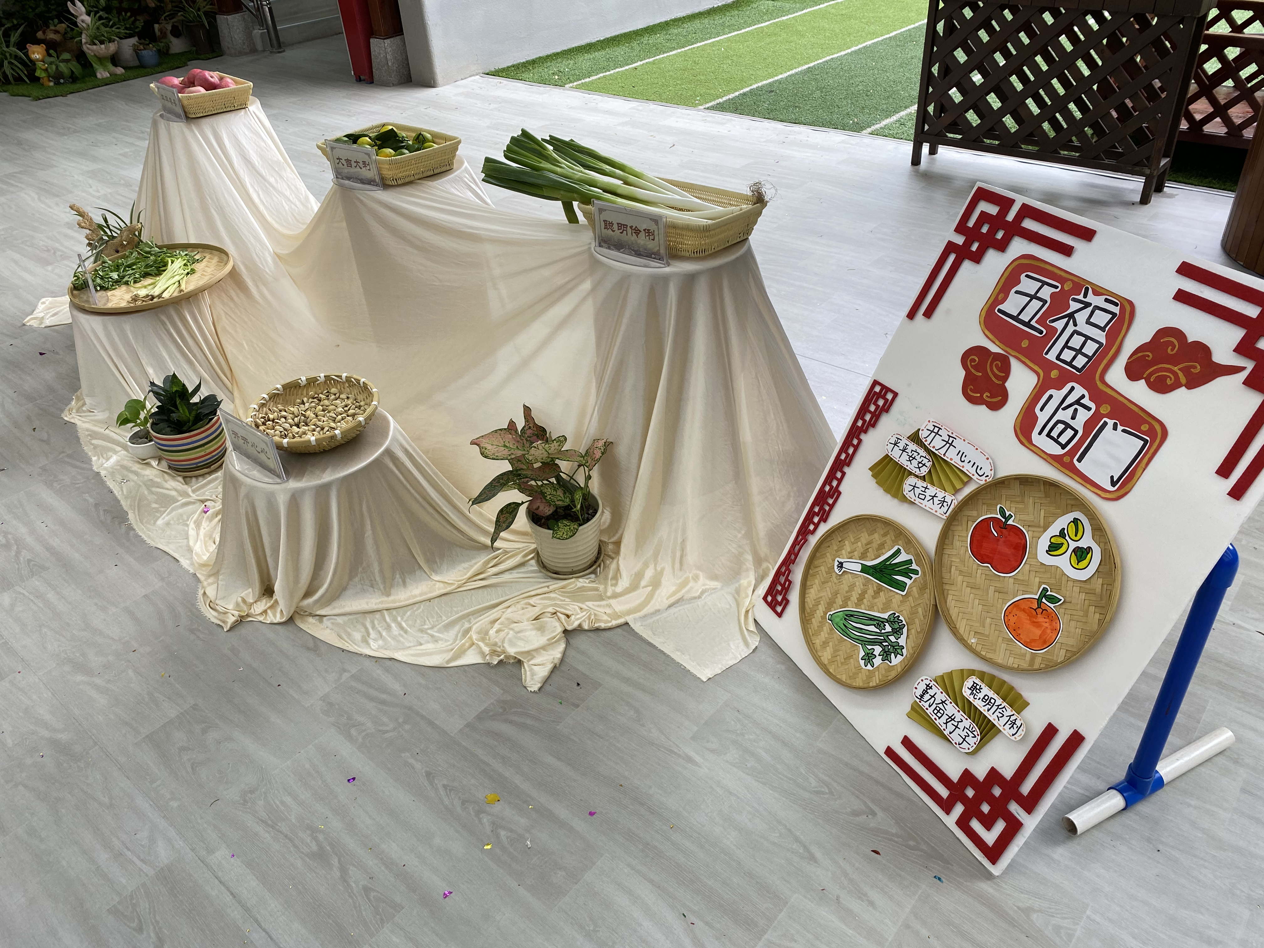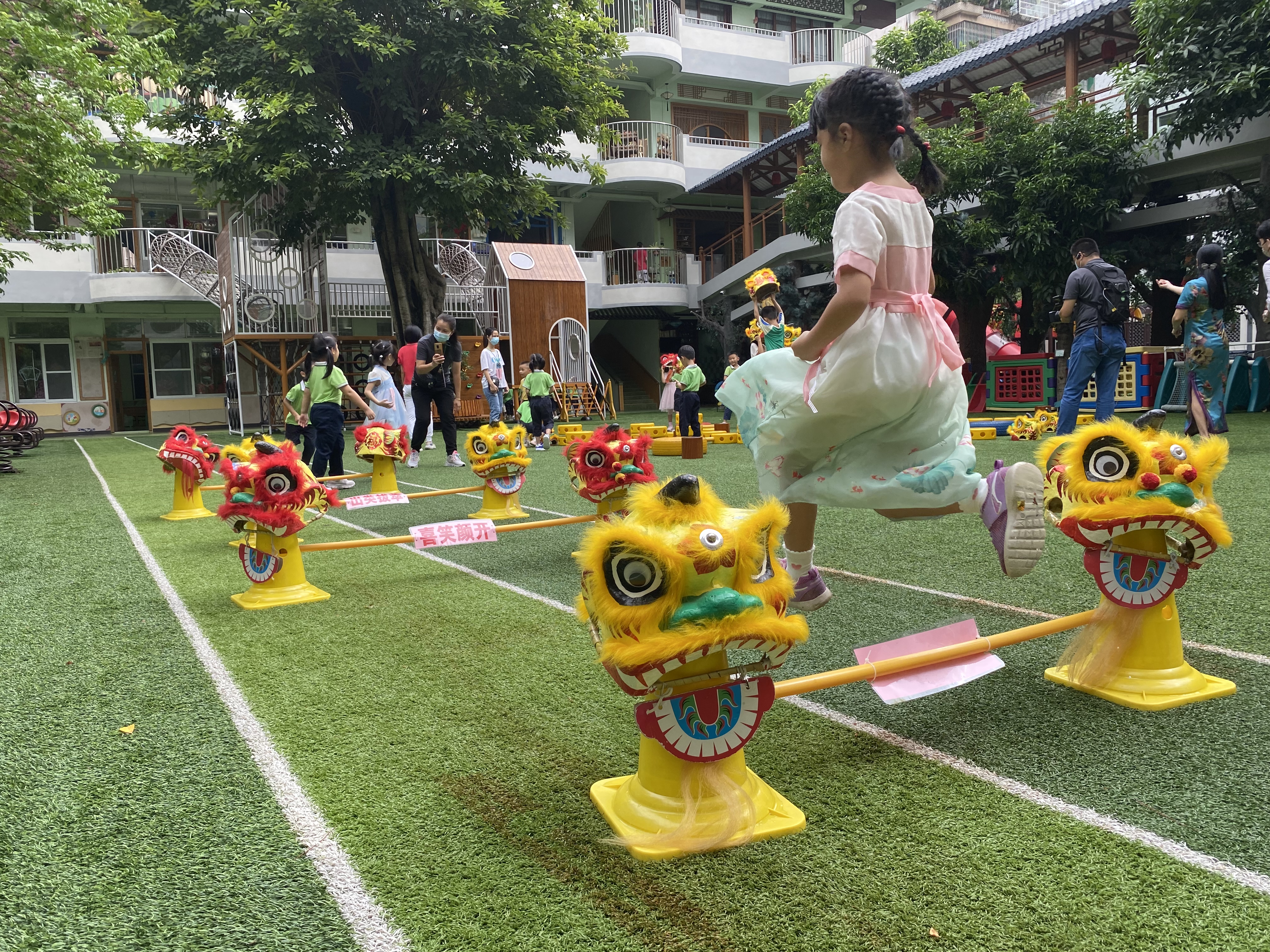 小朋友们进入幼儿园时,就要测体温、洗手消毒、点朱砂。进入幼儿园之后,园方为小朋友门准备了八仙过海、鲤跃龙门、醒狮过桩等具有传统文化特色的游戏。