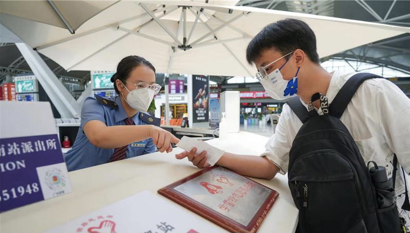 暑运期间,广州南站坚持常态化疫情防控不放松,设置33台红外测温仪,严格做好进出站旅客体温检测工作,设置14个健康码查验区域,配置24套5G智能核验防疫平台,严格做好健康码查验工作。落实好消毒、通风措施,对电梯、厕所、闸机等客服设备设施每4小时进行一次消毒,每天营业结束后对站场进行全面消毒。在进出站口、候车室等区域设置37台口罩机,供旅客自助免费领取口罩5.2万个。