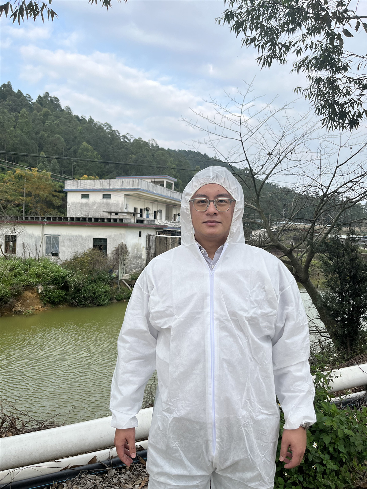 冯旭的猪场防疫很严格,进入猪场必须穿防护服。