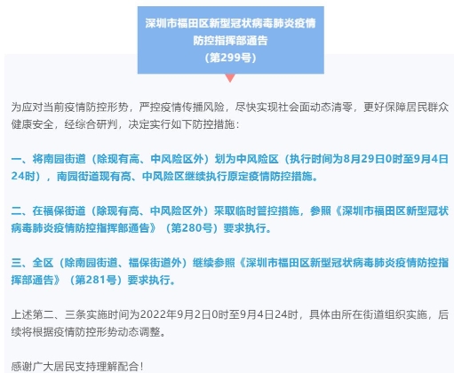 根据深圳市福田区新型冠状病毒肺炎疫情防控指挥部通告(第299号),福田区将南园街道(除现有高、中风险区外)划为中风险区;在福保街道(除现有高、中风险区外)采取临时管控措施,实行居家办公;全区(除南园街道、福保街道外)社区小区、城中村实行严格管理,强化社会面管控,严格限制人员聚集。上述第二、三条实施时间为今天(9月2日)0时至9月4日24时。