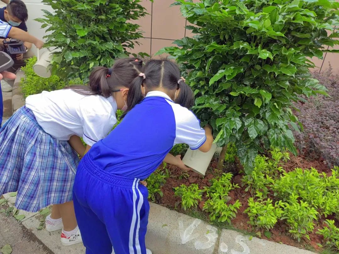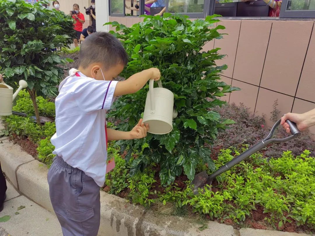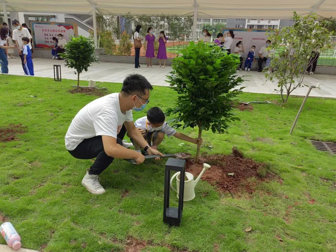 在典礼最后,民间林长和小林长共同在校园里种下“幸福树”。挖坑、移苗、填土、浇水……孩子们在亲手植树的过程中,体验劳动带来的乐趣。