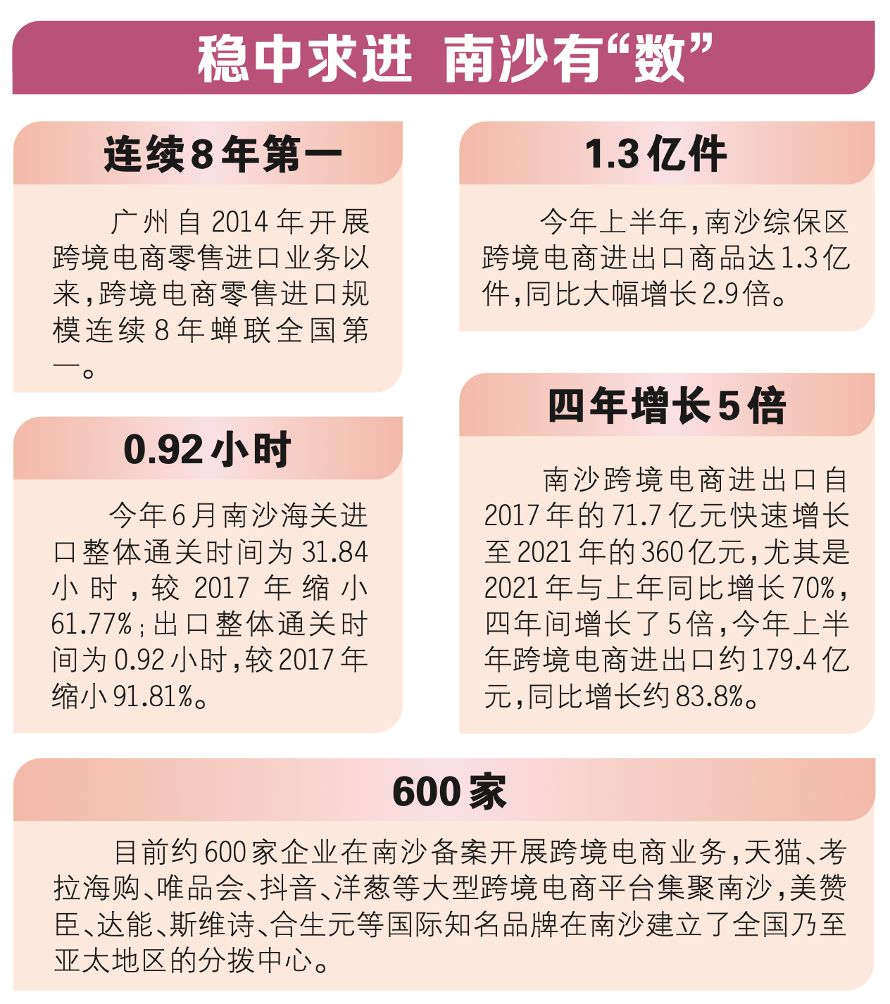 南沙跨境电商进出口自2017年的71.7亿元快速增长至2021年的360亿元,尤其是2021年与上年同比增长70%,四年间增长了5倍,今年上半年跨境电商进出口约179.4亿元,同比增长约83.8%。目前约600家企业备案开展跨境电商业务,天猫、考拉海购、唯品会、抖音、洋葱等大型跨境电商平台集聚南沙,美赞臣、达能,斯维诗、合生元等国际知名品牌在南沙建立了全国乃至亚太地区的分拨中心。
