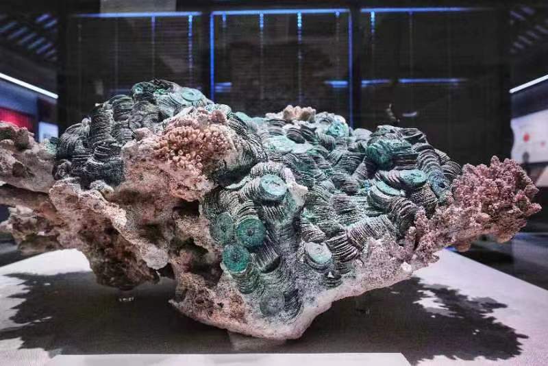 王恒介绍,“钱珊瑚”藏品出水于我国西沙海域,是宋代海上丝绸之路贸易沉船的铜钱与珊瑚结块,广东省文物鉴定站命名该藏品学术名为:“北宋铜钱水下沉积结块”。